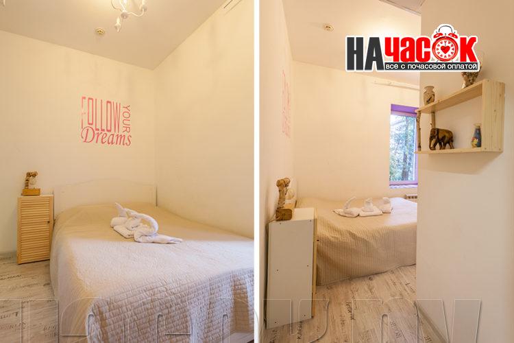 В комнате одна большая кровать, тумбочки, сделанные на заказ, прикроватный светильник, вешалка.