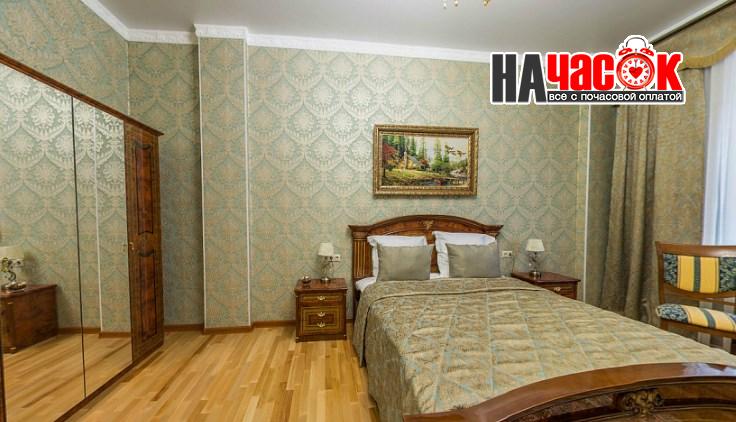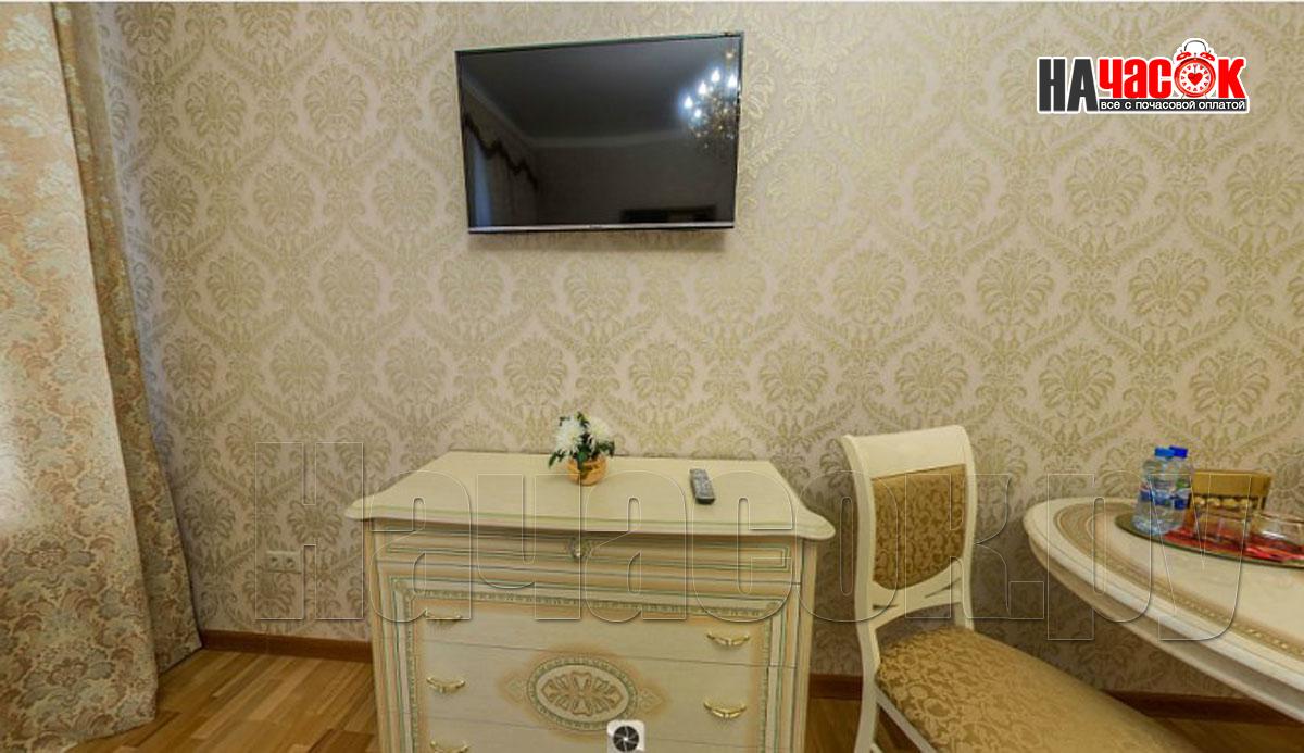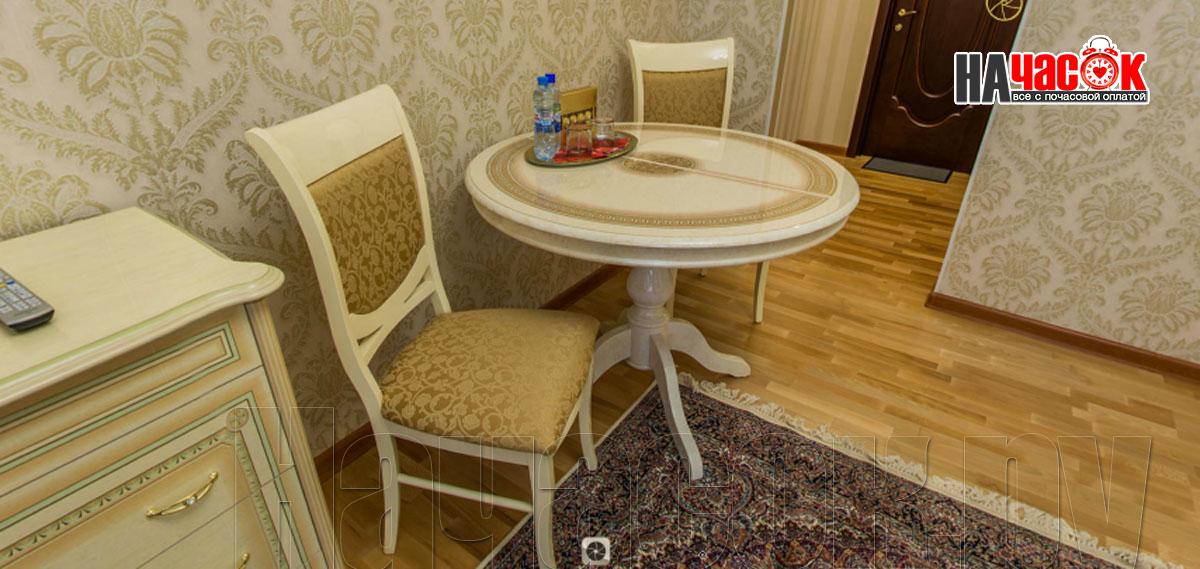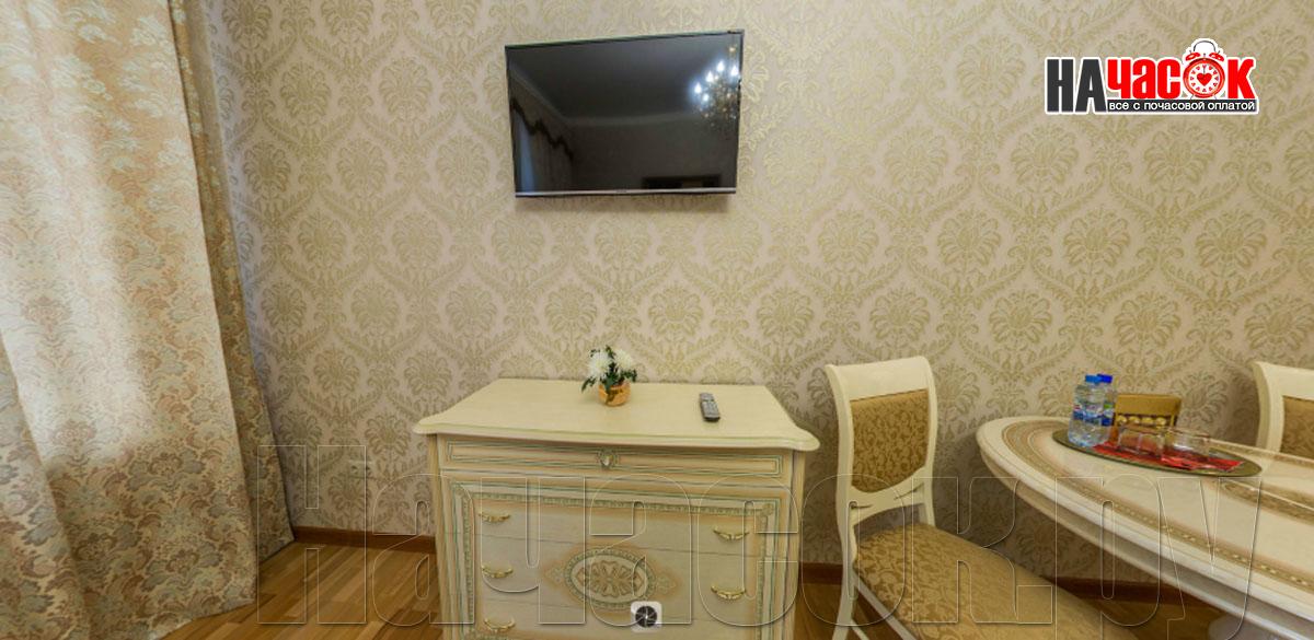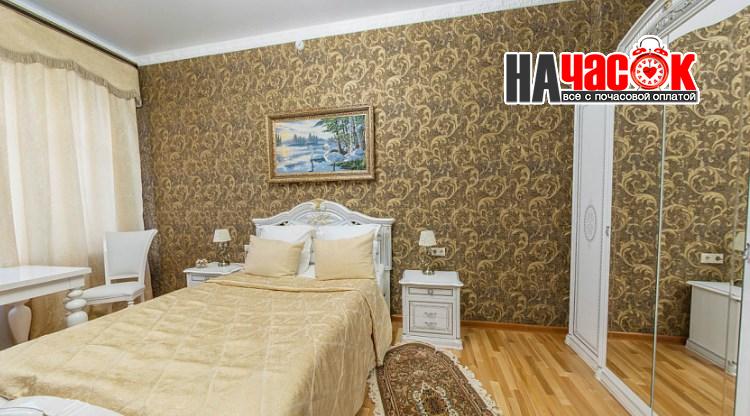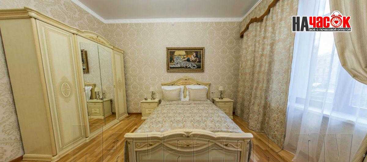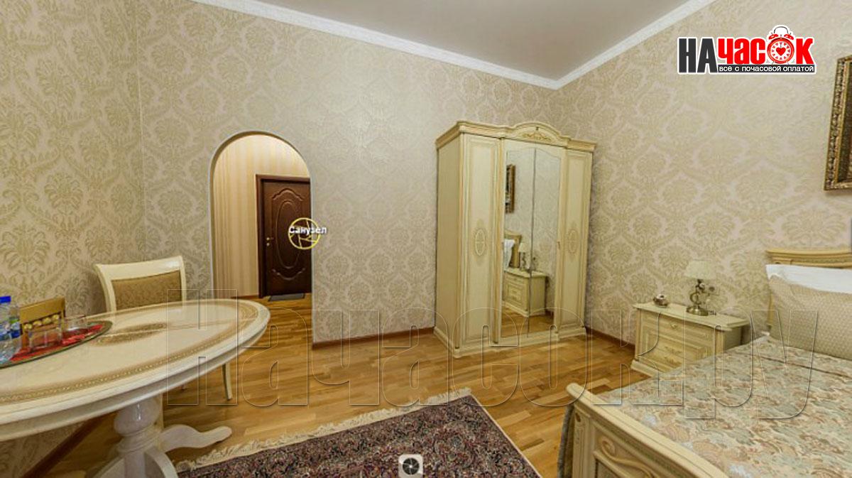 В комнате - двухспальная кровать оснащена ортопедическим матрацем, 4 подушки, комод, прикроватные тумбы 2, стол большой круглый, 2 стула, конфеты, минеральная вода с газом без, большой шкаф, ковёр, ночники, тюль, плотные шторы, картины.