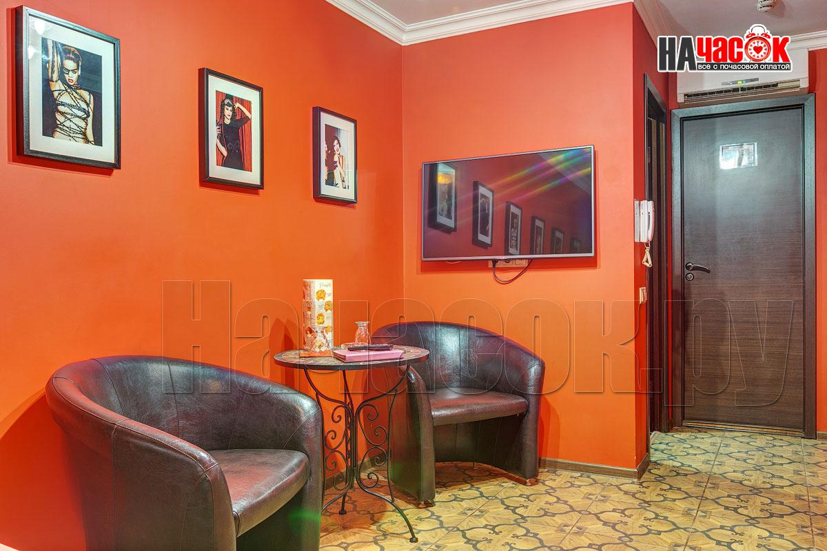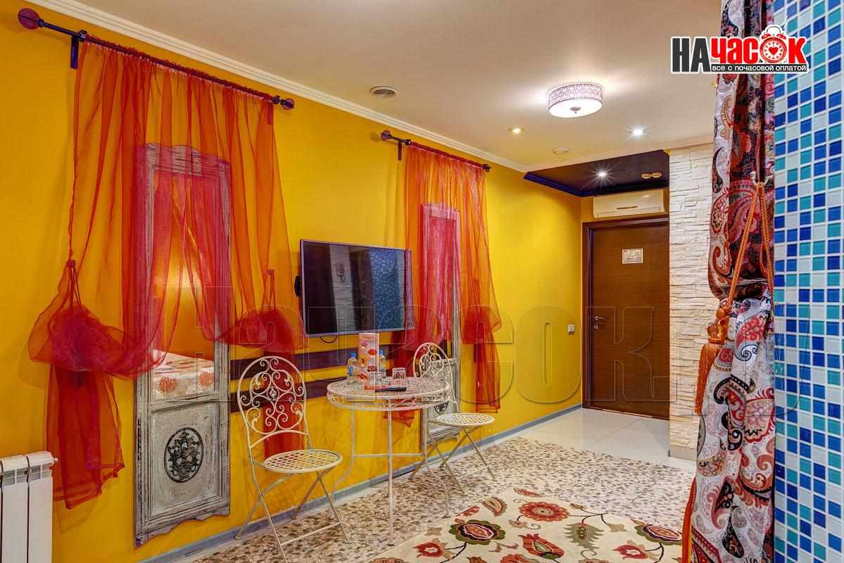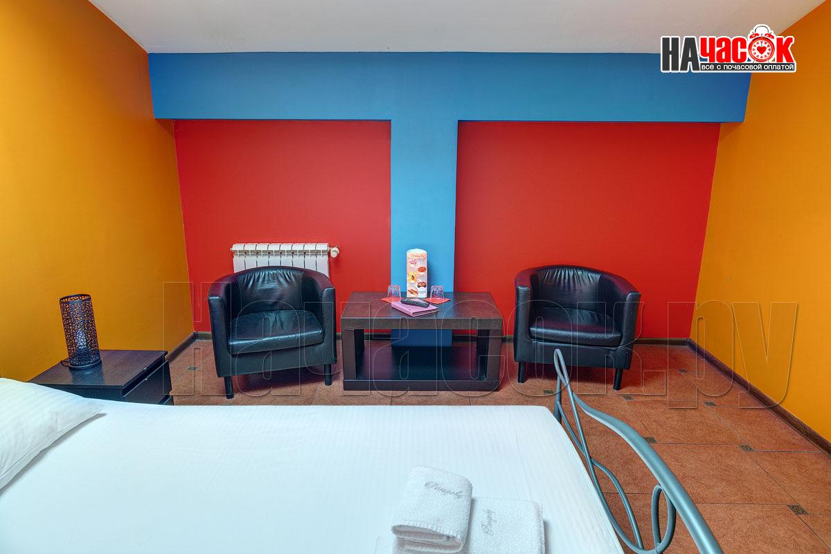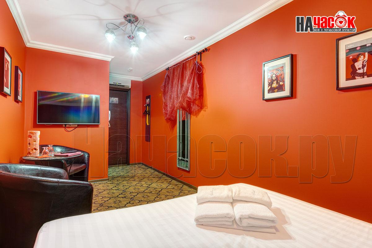 Большая плазменная панель, сплит система, большая двуспальная кровать, прикроватные тумбочки, зона отдыха, состоящая из двух стульев и стола. Санузел с душевой кабиной, туалетные и ванные принадлежности. Помимо этого в номере имеются: Лунные секс-качели Довольно популярный вариант, который представляет собой обычные качели с креплением для ног и спины. Крепятся к потолку, к стенке и даже турнику. Приспособление прочное и способно выдержать обоих. Лунные качели используются как во время прелюдий, так и в момент полового акта. С их помощью можно перепробовать большое многообразие поз, что позволит влюбленным открыть новые грани сексуальной жизни. Тантра-кресло Это элегантное кресло впишется в любой интерьер. В отличие от простой кровати обладает эргономичной формой с плавными изгибами, что позволяет экспериментировать в любовных играх настолько, насколько хватит фантазии. |