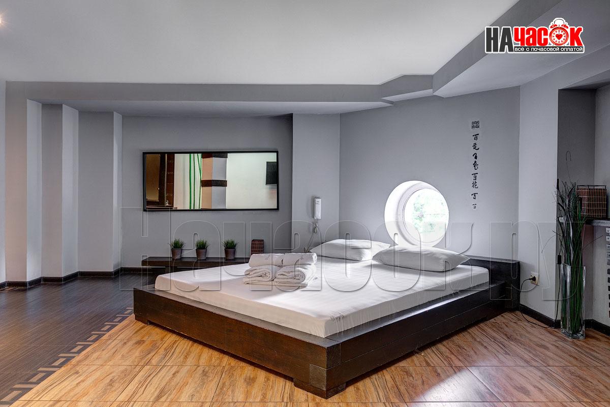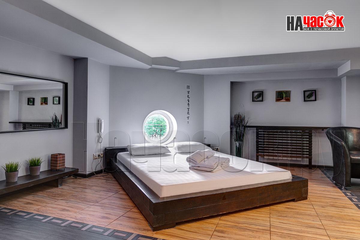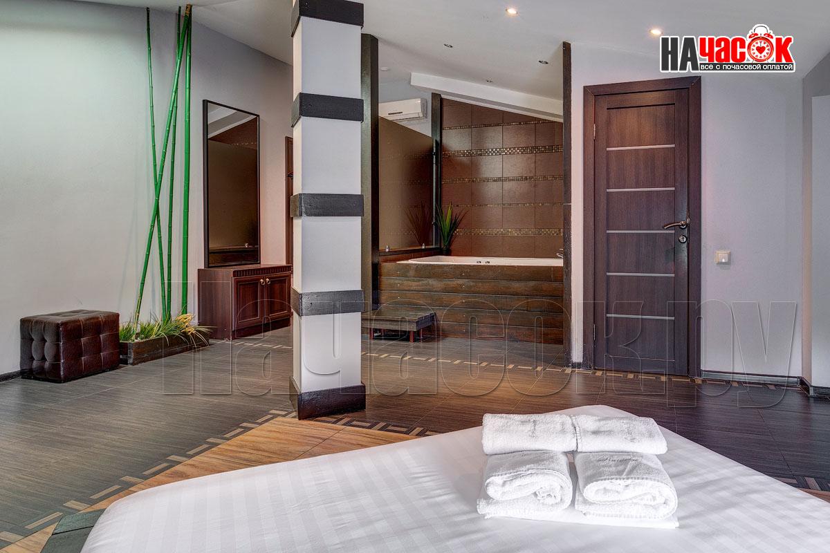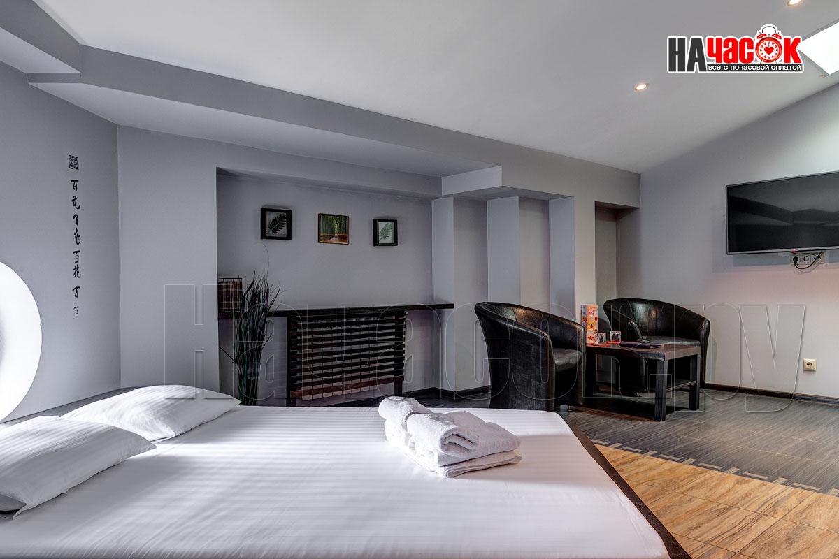 Дизайн номера выполнен в красочном японском стиле, по размерам номер больше чем полулюкс и эконом. В номере: Большой плазменный телевизор, сплит система, большая двуспальная дизайнерская кровать, прикроватные тумбочки, бра. Зона отдыха, состоящая из кресел и столика. Санузел с душевой кабиной, туалетные и ванные принадлежности. Номер данной категории оснащен джакузи. |