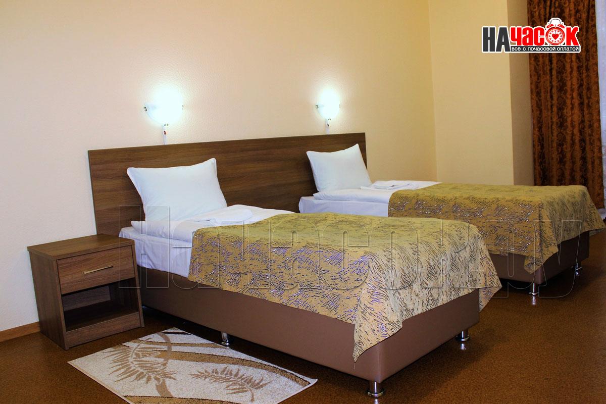 Двуспальная или две односпальные кровати, шкаф, стол, стулья, тумба, телефон, телевизор, холодильник, умывальник, туалет.