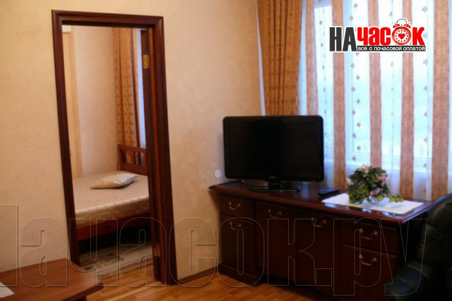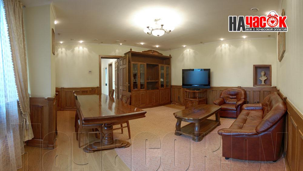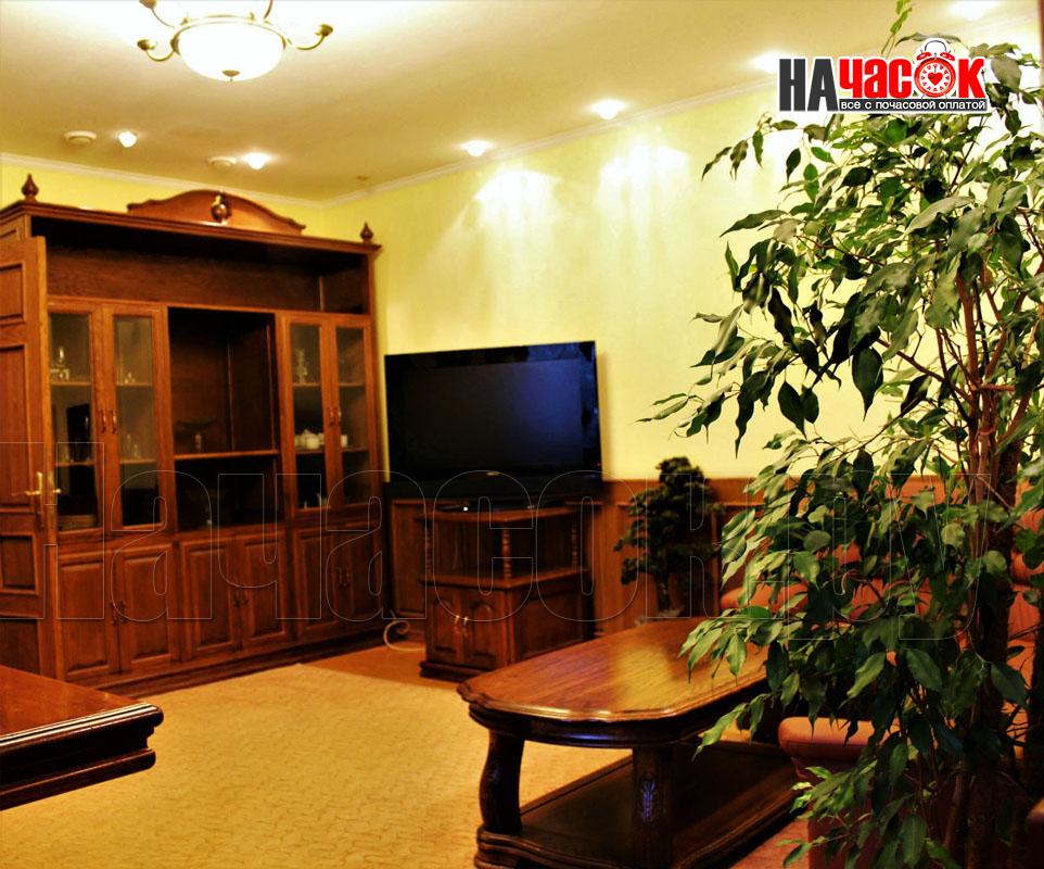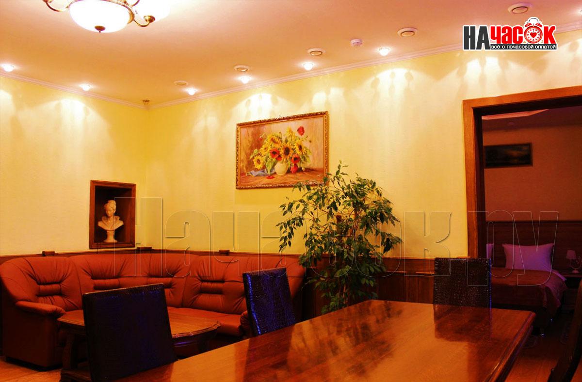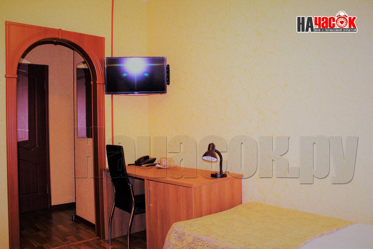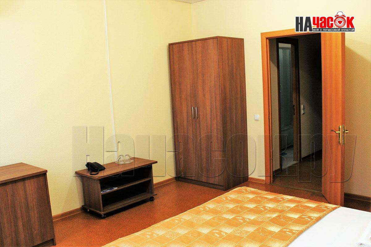 Спальня, гостиная, телевизор, холодильник, телефон, шкаф, диван, стол, стулья, тумбы, мини-кухня, ванная комната, туалет.