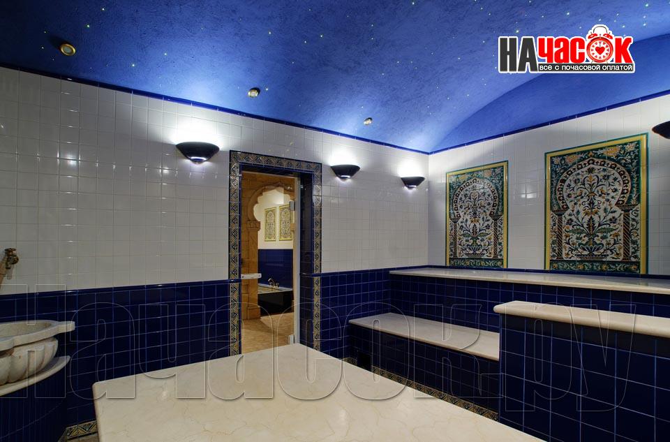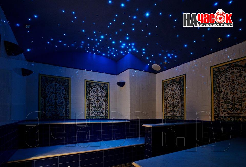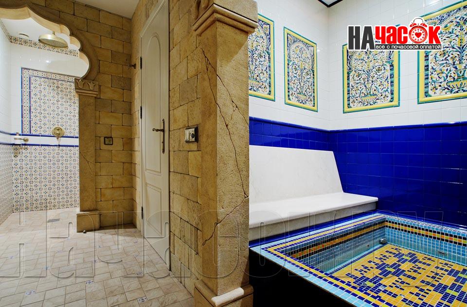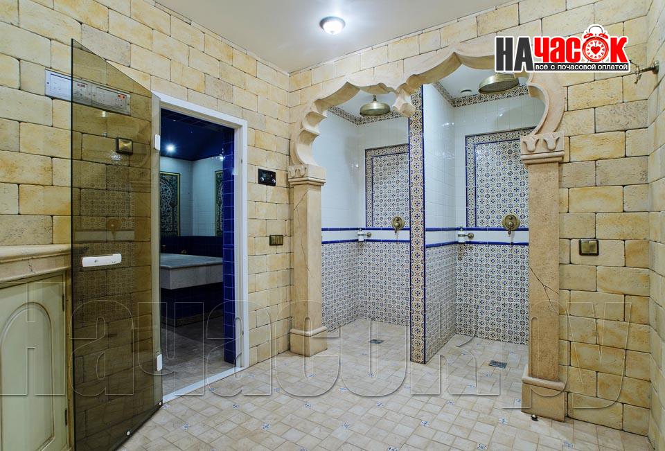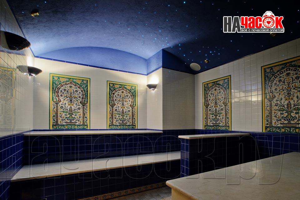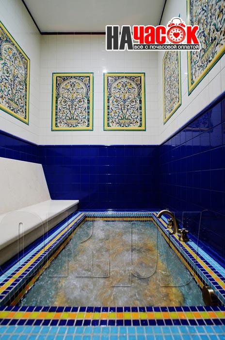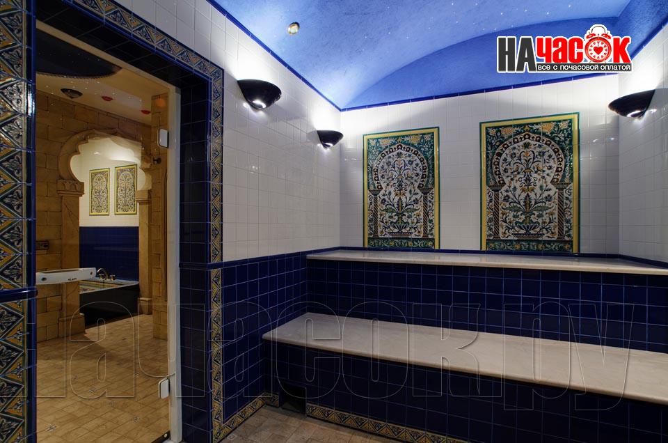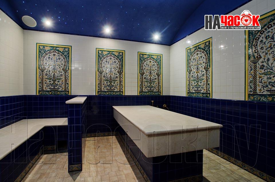 Просторный зал отдыха «Клуб 29» рассчитан на радушный прием компании до 20 человек. Красивая и невероятно уютная восточная обстановка зала отдыха предназначена для полной релаксации. Входя в помещение, так и хочется оставить за дверью все неурядицы повседневной жизни и погрузиться в экзотическую атмосферу Востока, народ которого славится умением полностью расслабляться и наслаждаться приятными для тела и души банными процедурами. Банкетная зона зала отдыха представлена большим столом для трапез, украшенным традиционным восточным орнаментом, мягким диваном-уголком с удобными подушками и валиками, также являющимися неизменными атрибутами отдыха в восточном стиле. Здесь установлен домашний кинотеатр с большим экраном, подключено спутниковое телевидение с пакетом каналов НТВ+, есть система караоке. Аудио- и видеоаппаратура располагается напротив дивана и «утоплена» в красивой куполообразной нише. Потолок и стены зала украшают восточные светильники, отбрасывающие разноцветные блики и придающие интерьеру загадочность. Все помещения этого заведения прекрасно кондиционируются. Для осуществления процедуры парения клиентам предлагается посетить турецкую парную. Турецкий хамам своим происхождением обязан древним римским термам. Слово «хамам» образовано от арабского слова «хам», что в переводе обозначает «жарко». Турки всегда очень щепетильно относились к гигиеническим процедурам и культуре купания, хамам посещали не только с целью омовения тела, но и для душевного отдыха. Эти традиции сохранились и поныне. Хамам в «Клуб 29» исполнен в сине-белой цветовой гамме. В отличие от традиционных русской и финской парных, в турецкой бане никогда не используется дерево. Преимущество отдается мрамору, мозаике и керамической плитке. Стены парной украшены восточными орнаментами, куполообразный потолок исполнен в виде «неба в алмазах». Возле стен обустроены мраморные лежаки, есть «чаша» для омовения и гекташи. В этом заведении клиенты могут заказать услуги банщика, различные программы по телу, традиционные для хамама турецкий пилинг и мыльный массаж, а также ароматерапия. Можно сделать заказ на расслабляющий или оздоровительный массаж. После парения посетители могут воспользоваться роскошным бассейном. Размер бассейна 4×6 метров, вода в нем фильтруется и подогревается, есть искусственное течение, гейзер и гидромассаж. Бассейн облицован мозаикой, из которой на дне выполнен узор, напоминающий восточный ковер. В бассейн ведут широкие удобные ступени, по периметру расположена ступень для сидения, также украшенная восточным орнаментом. Бассейн отделен от остальных помещений очень красивым ограждением с колоннами и арками. Потолок над бассейном имеет вид ясного неба с воздушными облаками. Для полноценного отдыха гостей угостят вкуснейшими ресторанными блюдами, предложат покурить кальян и насладиться шоу-программу. Отдельно следует остановиться на роскошных комнатах отдыха, оборудованных в этом зале. Каждая из двух комнат является настоящим раем для влюбленных: просторные кровати с большим количеством мягких подушек и романтические восточные балдахины создают невероятный уют в помещениях. Сауна «Клуб 29» великолепно подойдет для организации любого праздничного мероприятия, приятного проведения досуга и романтической вс