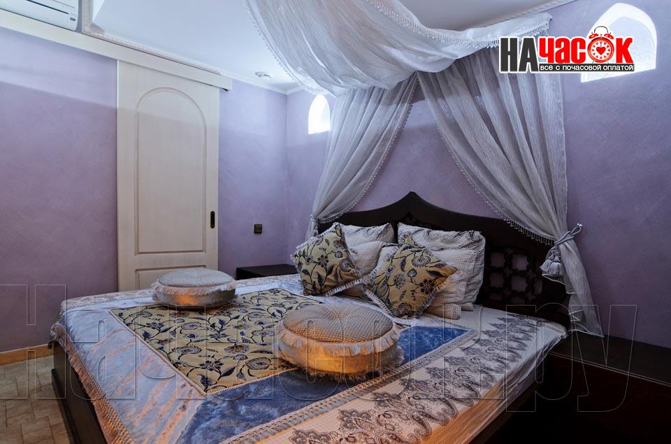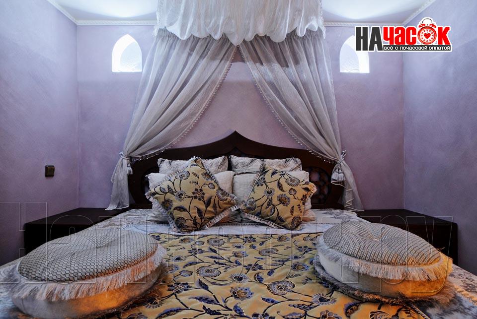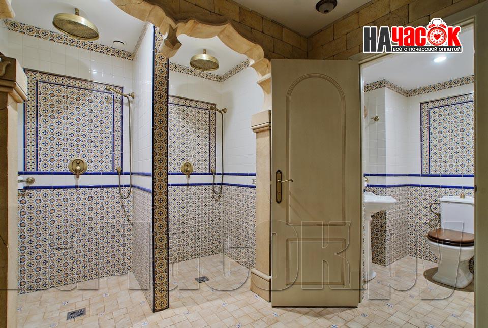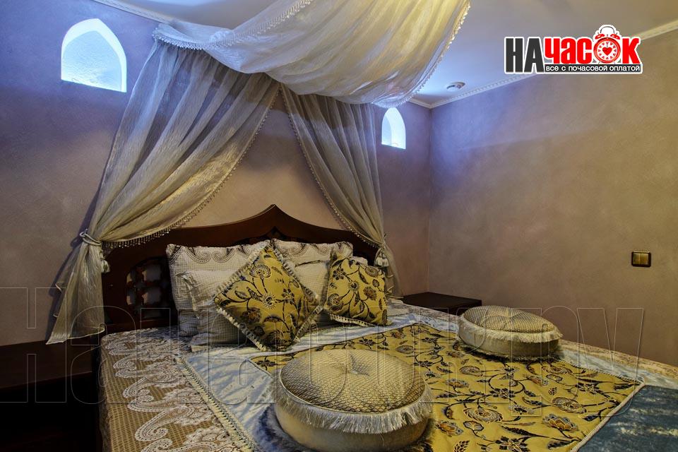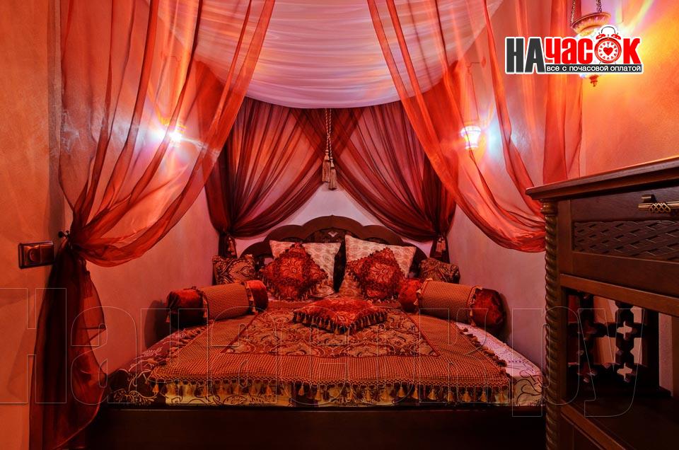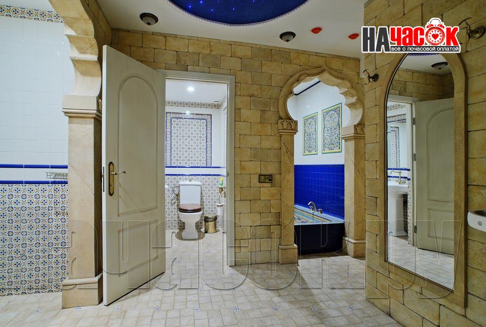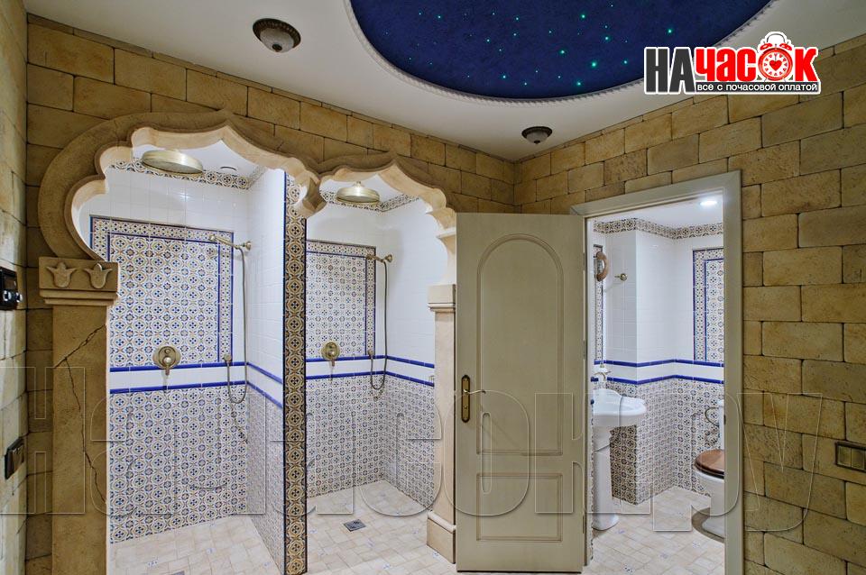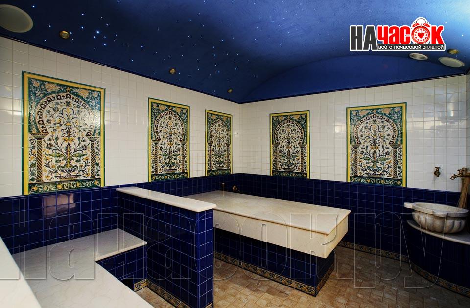 Просторный зал отдыха «Клуб 29» рассчитан на радушный прием компании до 20 человек. Красивая и невероятно уютная восточная обстановка зала отдыха предназначена для полной релаксации. Входя в помещение, так и хочется оставить за дверью все неурядицы повседневной жизни и погрузиться в экзотическую атмосферу Востока, народ которого славится умением полностью расслабляться и наслаждаться приятными для тела и души банными процедурами. Банкетная зона зала отдыха представлена большим столом для трапез, украшенным традиционным восточным орнаментом, мягким диваном-уголком с удобными подушками и валиками, также являющимися неизменными атрибутами отдыха в восточном стиле. Здесь установлен домашний кинотеатр с большим экраном, подключено спутниковое телевидение с пакетом каналов НТВ+, есть система караоке. Аудио- и видеоаппаратура располагается напротив дивана и «утоплена» в красивой куполообразной нише. Потолок и стены зала украшают восточные светильники, отбрасывающие разноцветные блики и придающие интерьеру загадочность. Все помещения этого заведения прекрасно кондиционируются. Для осуществления процедуры парения клиентам предлагается посетить турецкую парную. Турецкий хамам своим происхождением обязан древним римским термам. Слово «хамам» образовано от арабского слова «хам», что в переводе обозначает «жарко». Турки всегда очень щепетильно относились к гигиеническим процедурам и культуре купания, хамам посещали не только с целью омовения тела, но и для душевного отдыха. Эти традиции сохранились и поныне. Хамам в «Клуб 29» исполнен в сине-белой цветовой гамме. В отличие от традиционных русской и финской парных, в турецкой бане никогда не используется дерево. Преимущество отдается мрамору, мозаике и керамической плитке. Стены парной украшены восточными орнаментами, куполообразный потолок исполнен в виде «неба в алмазах». Возле стен обустроены мраморные лежаки, есть «чаша» для омовения и гекташи. В этом заведении клиенты могут заказать услуги банщика, различные программы по телу, традиционные для хамама турецкий пилинг и мыльный массаж, а также ароматерапия. Можно сделать заказ на расслабляющий или оздоровительный массаж. После парения посетители могут воспользоваться роскошным бассейном. Размер бассейна 4×6 метров, вода в нем фильтруется и подогревается, есть искусственное течение, гейзер и гидромассаж. Бассейн облицован мозаикой, из которой на дне выполнен узор, напоминающий восточный ковер. В бассейн ведут широкие удобные ступени, по периметру расположена ступень для сидения, также украшенная восточным орнаментом. Бассейн отделен от остальных помещений очень красивым ограждением с колоннами и арками. Потолок над бассейном имеет вид ясного неба с воздушными облаками. Для полноценного отдыха гостей угостят вкуснейшими ресторанными блюдами, предложат покурить кальян и насладиться шоу-программу. Отдельно следует остановиться на роскошных комнатах отдыха, оборудованных в этом зале. Каждая из двух комнат является настоящим раем для влюбленных: просторные кровати с большим количеством мягких подушек и романтические восточные балдахины создают невероятный уют в помещениях. Сауна «Клуб 29» великолепно подойдет для организации любого праздничного мероприятия, приятного проведения досуга и романтической вс