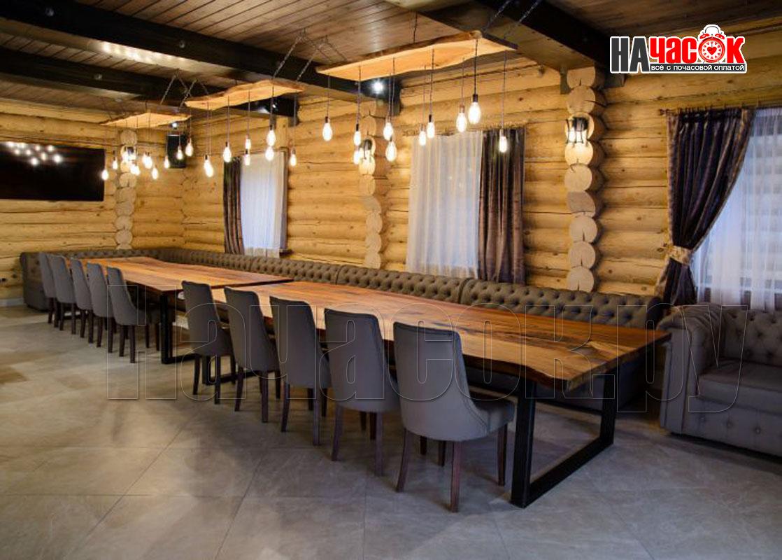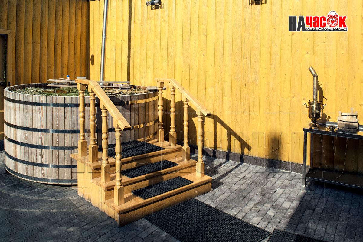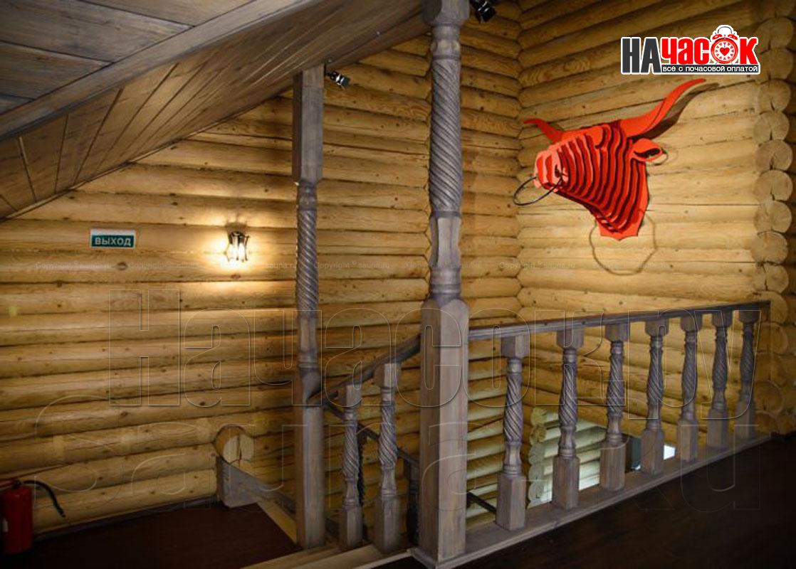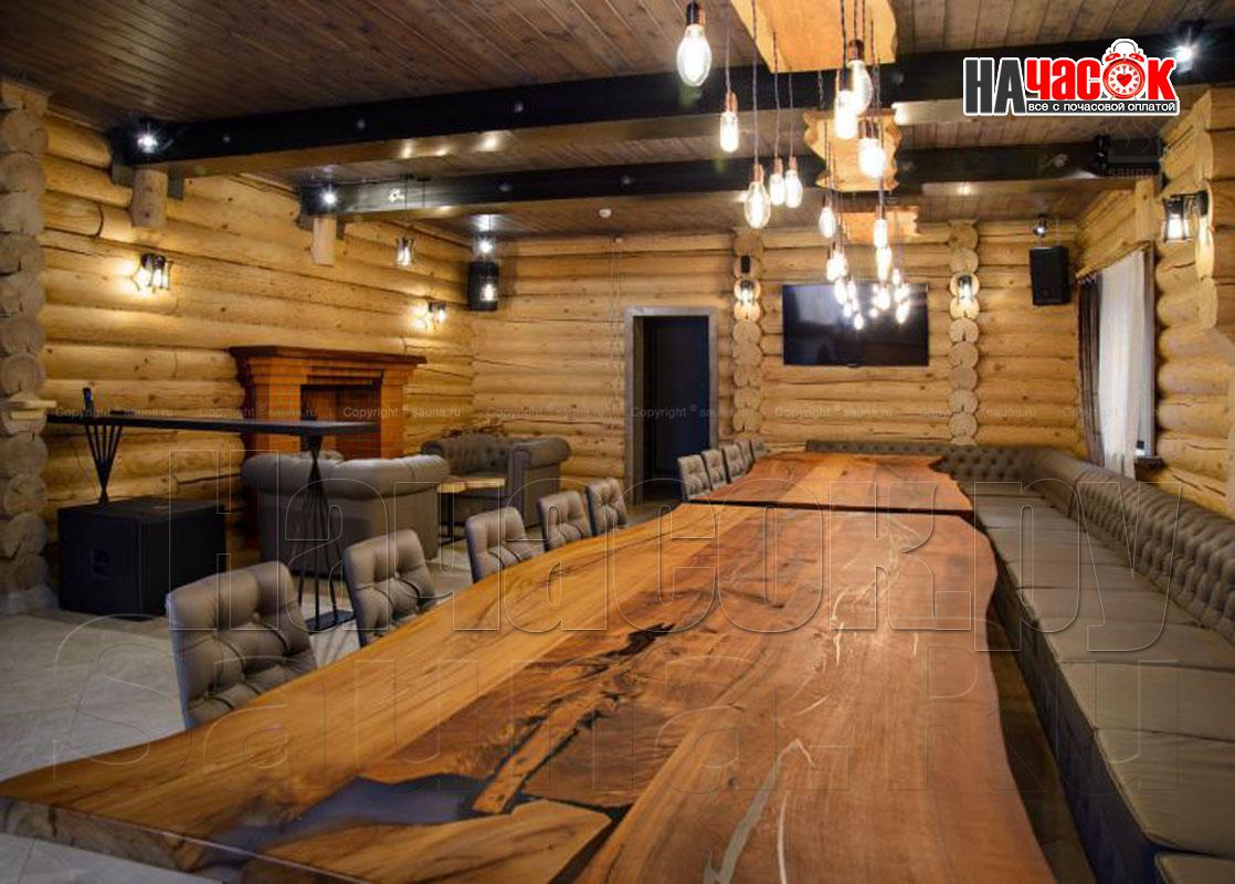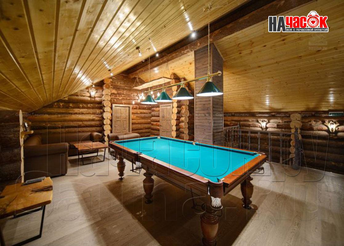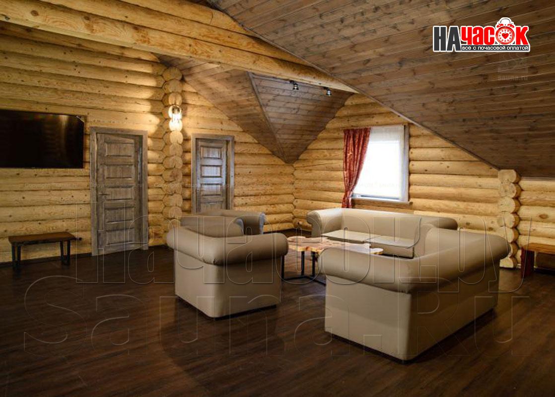 На первых этажах просторные залы с каминами и обеденными зонами с мягкой мебелью и столами выполненных из цельных спилов деревьев сосновых пород (слеб). Профессиональное караоке AST в сочетании с акустикой JBL воспроизводит неповторимый звук. Так же на первых этажах находится, сердце русской бани, парная с открытой и закрытой каменкой, которая топится исключительно берёзовыми дровами. Отделка парных выполнена липовой не обрезной доской, высокогорной пихтой и липовым горбылём с сохраненным лыковым слоем, а полки из абаша. Каждый сруб имеет отдельный внутренний дворик с бассейном с подогревом , купелью с погружной печью на берёзовых дровах, выполненной из лиственницы или кедра вместимостью до 8 человек, мангалами, сеновалами и зонами отдыха с обеденными столами. На вторых этажах расположены зоны пассивного и активного отдыха с профессиональными бильярдными столами, современными игровыми консолями.