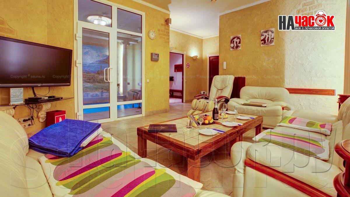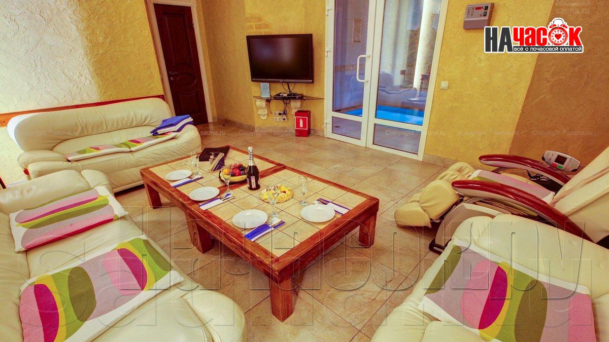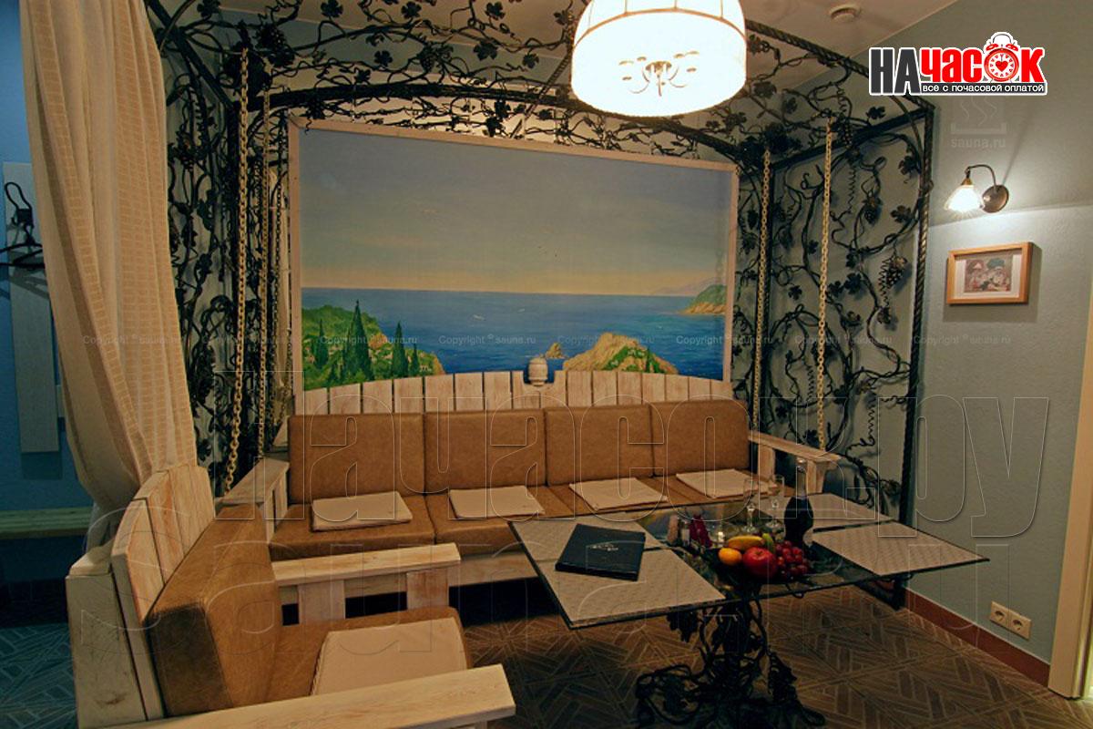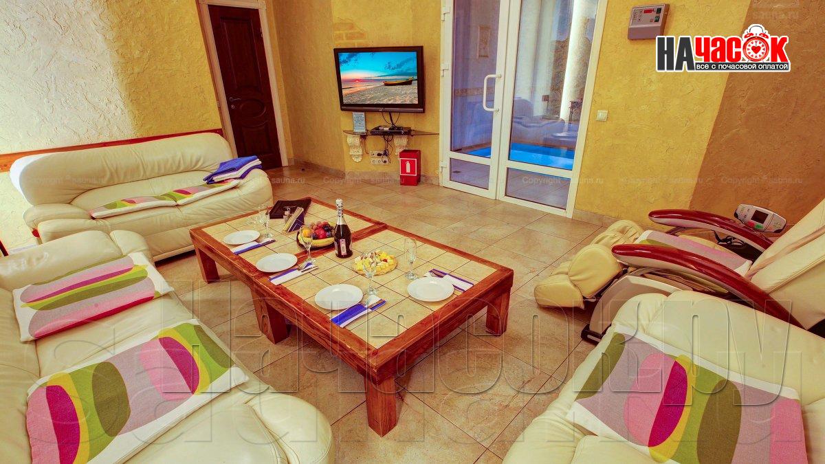 Зал Ялта рассчитан до 4-х гостей, гостиная с мягкой мебелью, аудио-видео аппаратура, кондиционер, бассейн 2х2 с гидромассажем, подогрев, фильтрация, подсветка, парная – турецкий хамам с натуральными ароматами трав. Банные услуги: Банщик, Ароматерапия, ароматы для парной, Косметический пиллинг