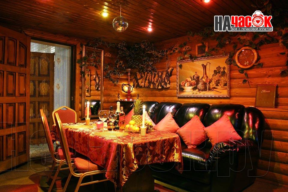 Зал отдыха сауны «Лагуна» имеет вид деревянного сруба. Приятный золотисто-коричневый оттенок древесины, обилие зелени и наличие большого количества элементов декора создают невероятно уютную обстановку. В банкетной зоне установлен большой удобный кожаный диван-уголок и стол для блюд и напитков. На столе всегда находится ресторанное меню, поэтому при организации здесь праздничного мероприятия у вас будет большой выбор разнообразных блюд и напитков. В заведении работает собственная кухня с поварами-профессионалами. Однако за дополнительную плату здесь разрешается приносить с собой свою еду и напитки.