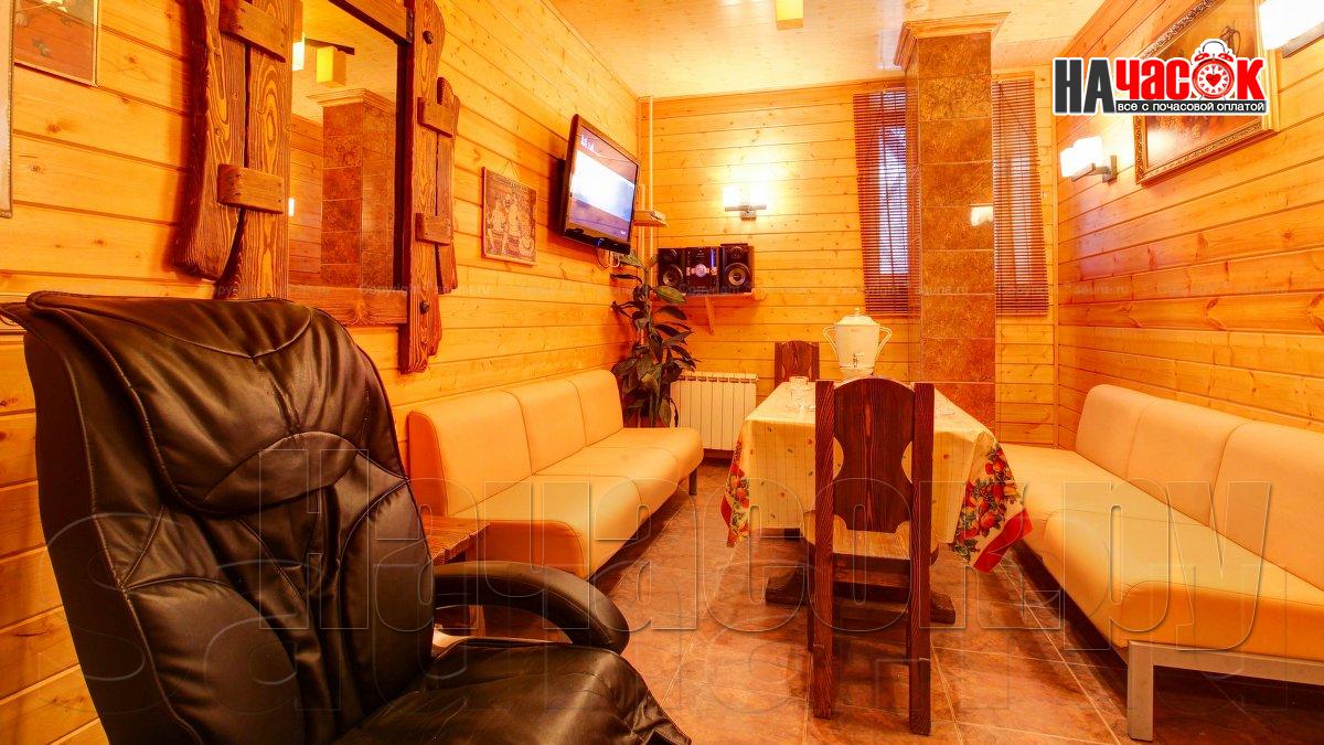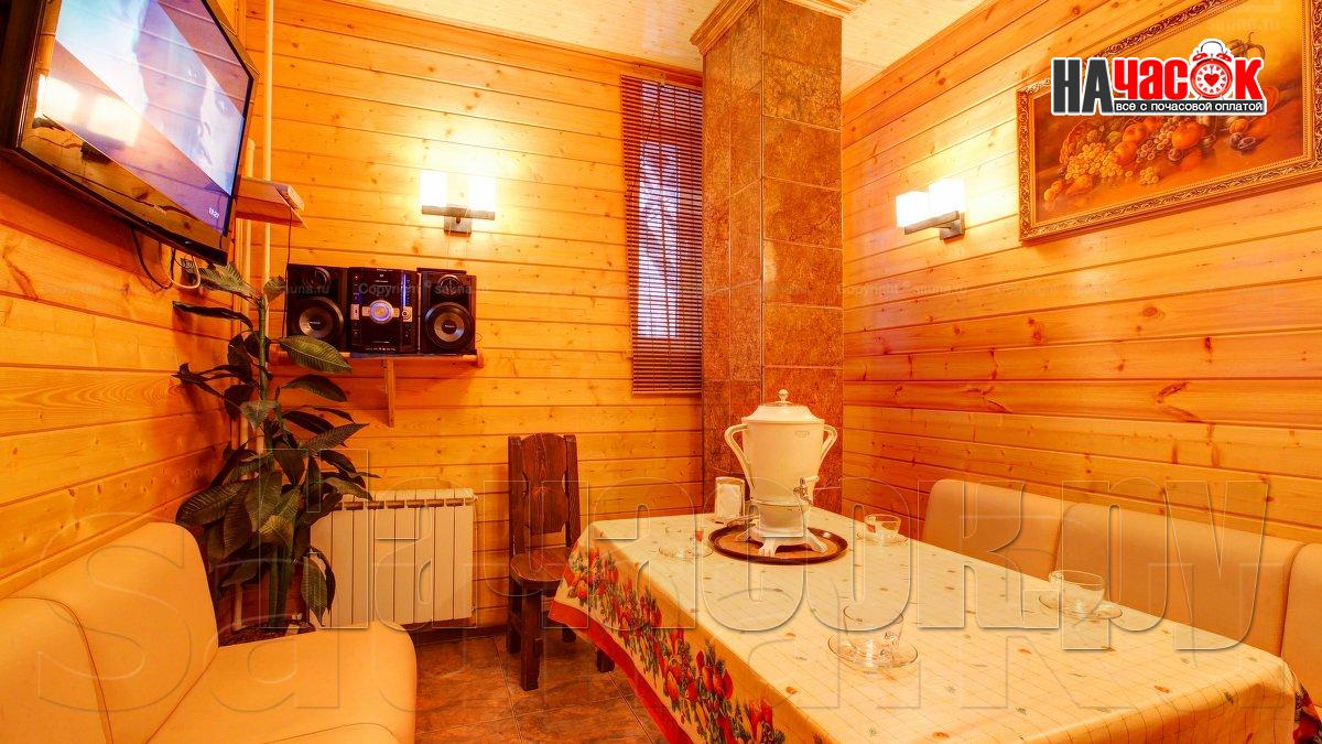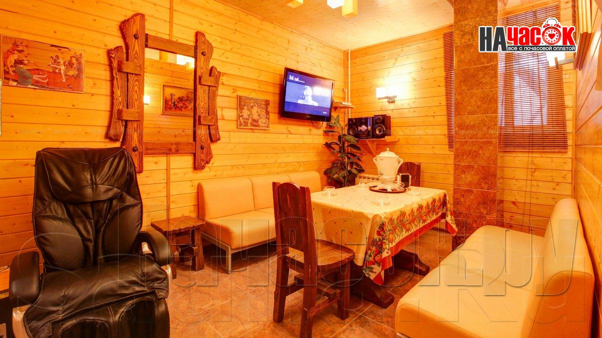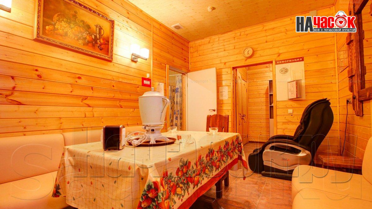 Сауна вмещает до 6 человек, печь электрическая на камнях (возможно пропариться с вениками), чайная зона на 6 мест, массажное кресло, телевизор три-колор, зал отдыха два дивана, душевая.