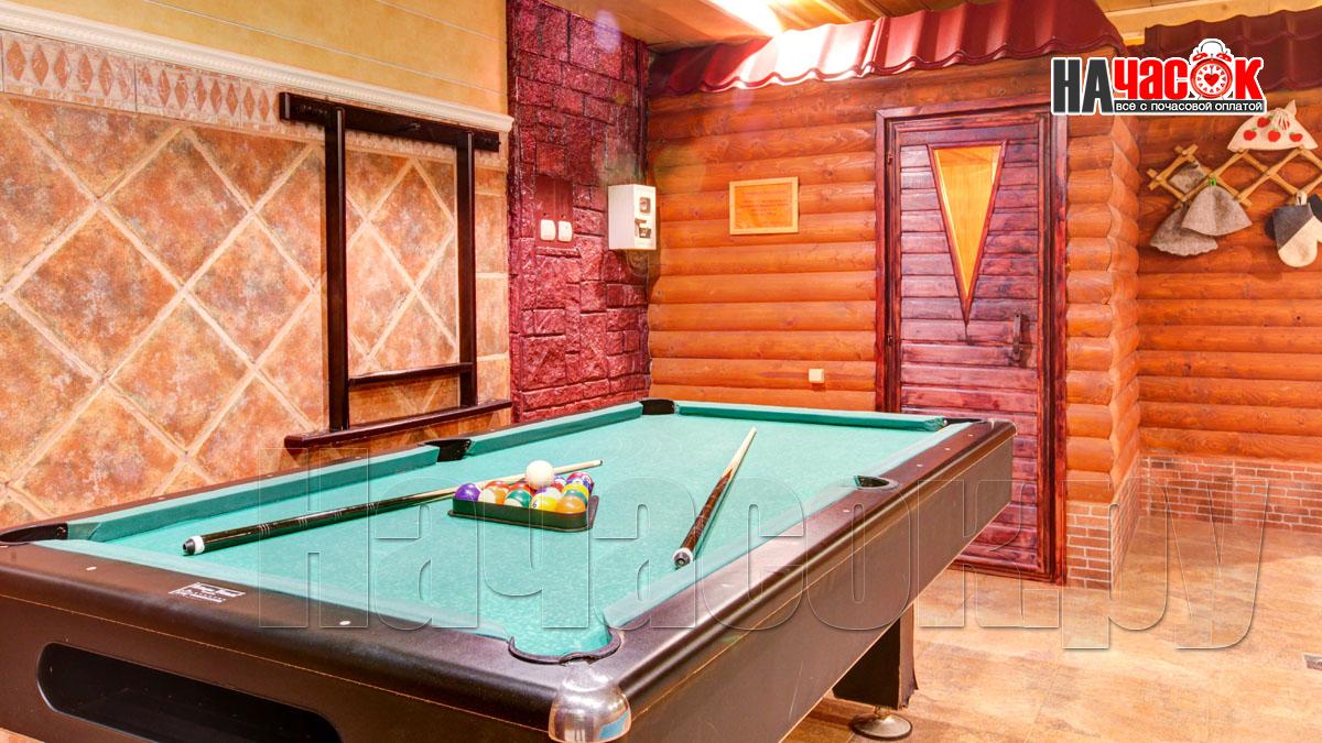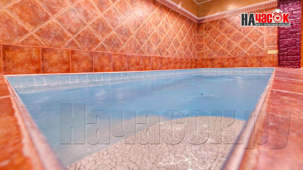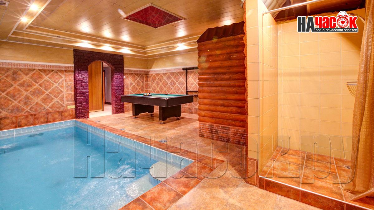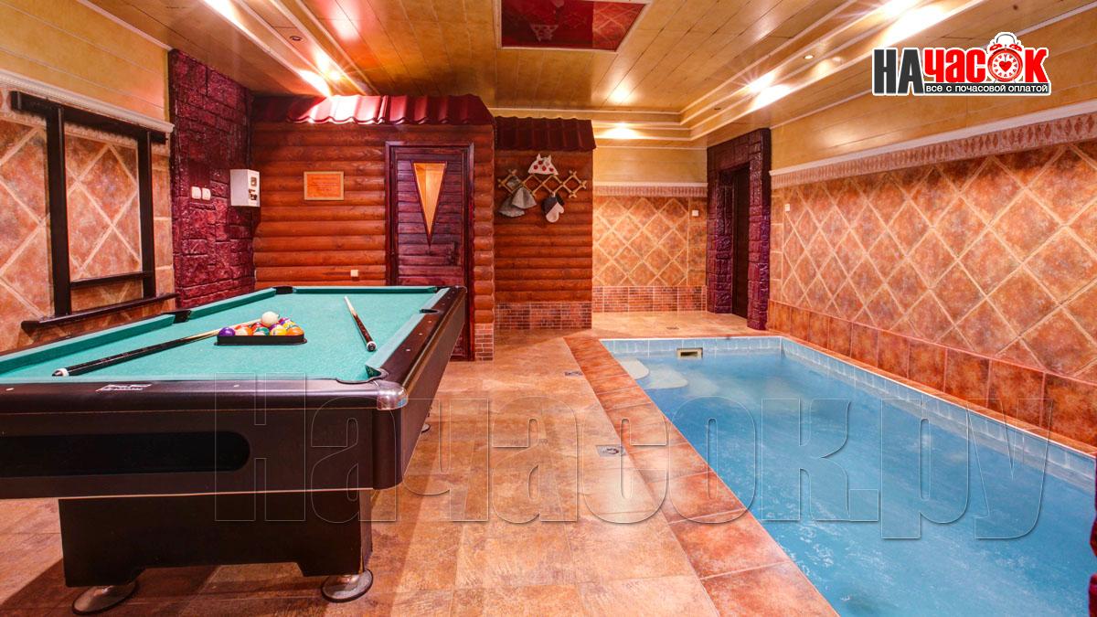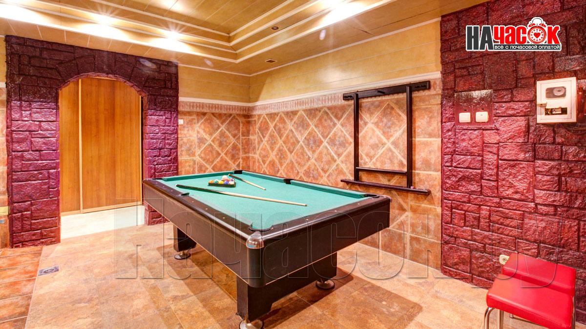 В просторном помещении с бассейном, облицованном нескользкой плиткой, установлен стол для игры в американский бильярд. Это помещение имеет красивую подсветку, а в самом бассейне есть искусственное течение. Широкие ступеньки бассейна очень удобные и нескользкие.