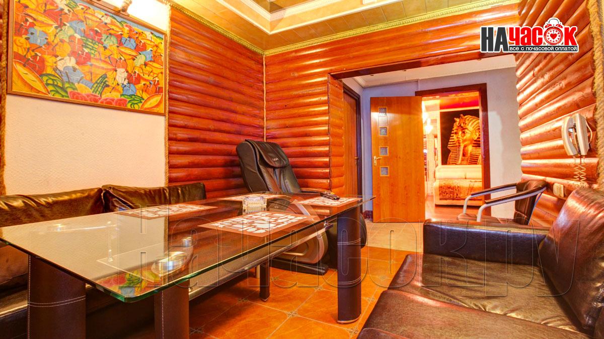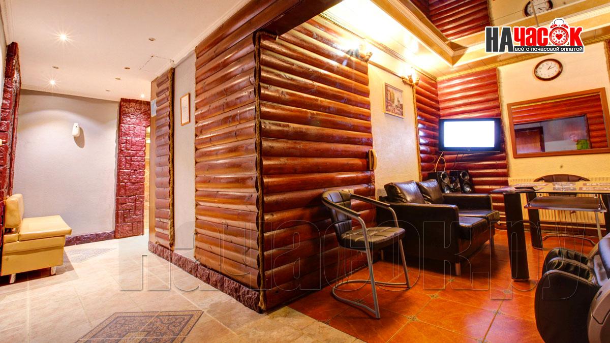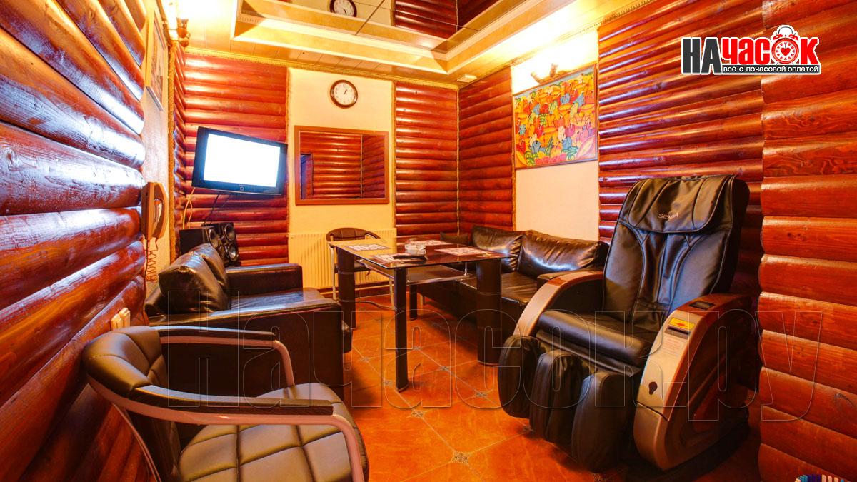 Зал отдыха сауны на Минской оформлен в традиционном банном стиле в виде деревянного сруба. Приятный оттенок древесины, красивые картины на стенах и мягкая подсветка создают теплую и уютную атмосферу. Зал имеет удобную зону для банкета, где установлен стеклянный стол для трапез, стулья и мягкие кожаные диваны. Потолок облицован зеркалами, имеется кондиционер. Для приятного отдыха зал оснащен современной аудио- и видеотехникой: есть домашний кинотеатр и система караоке. В зале есть кальян и массажное кресло, в котором можно насладиться приятной процедурой массажа после посещения парной, одновременно слушая любимую музыку или занимаясь просмотром увлекательного художественного фильма, развлекательной передачи или спортивного матча.