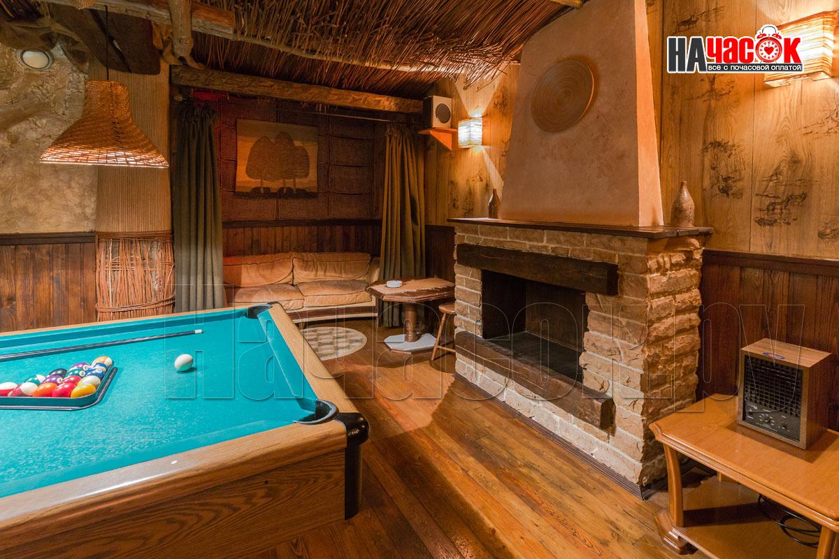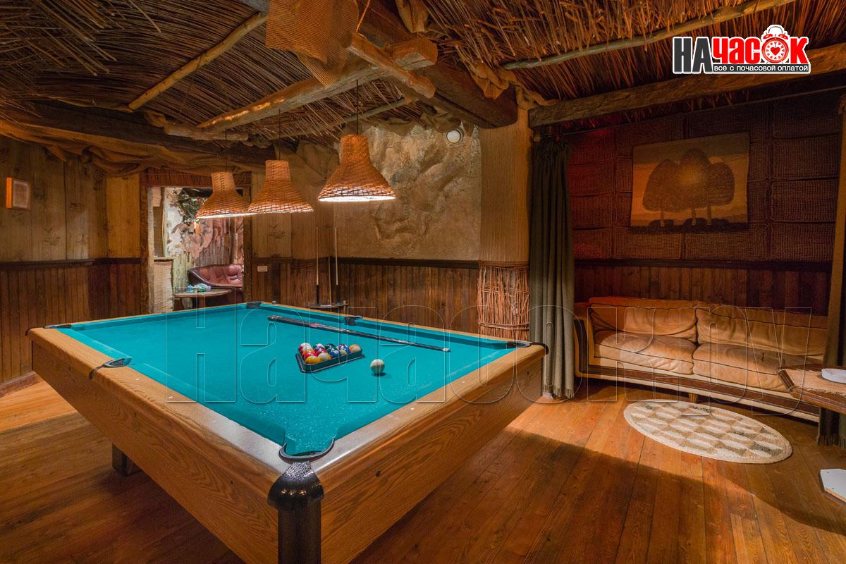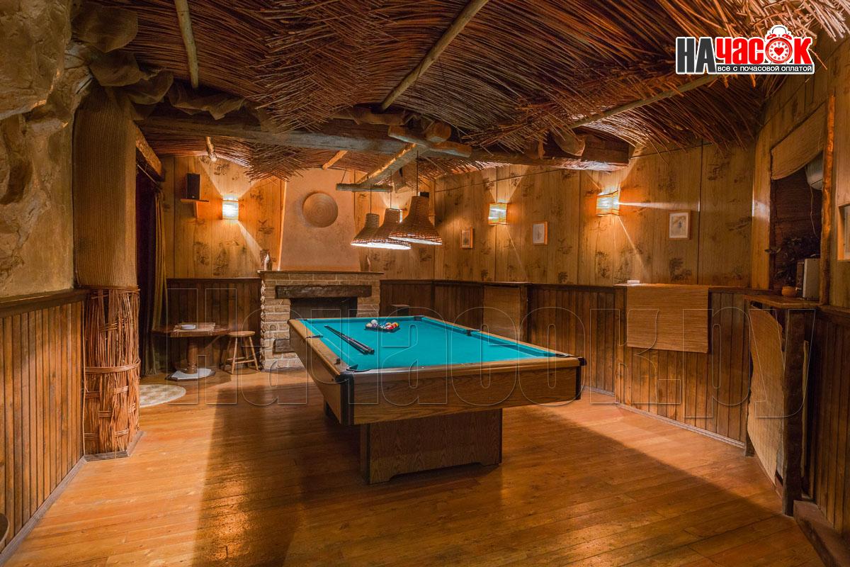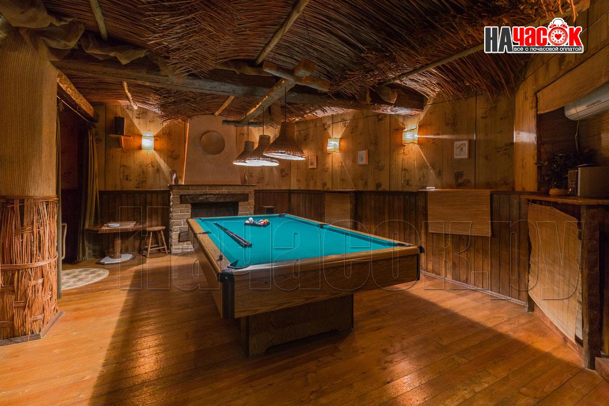 В зале установлен аквариум с рыбками. Рыба по имени ПЁТР))) наш ТАЛИСМАН порадует Вас и настроит на позитивный отдых. Над обеденной зоной нашими дизайнерами сделан потолок с виде бунгало ,что даёт преимущество проведения удачной фотосессии. Создаёт комфортную, романтическую обстановку. Для вашего развлечения имеется отдельная комната с американским бильярдом 8 фут., так же дартс и настольные игры.
