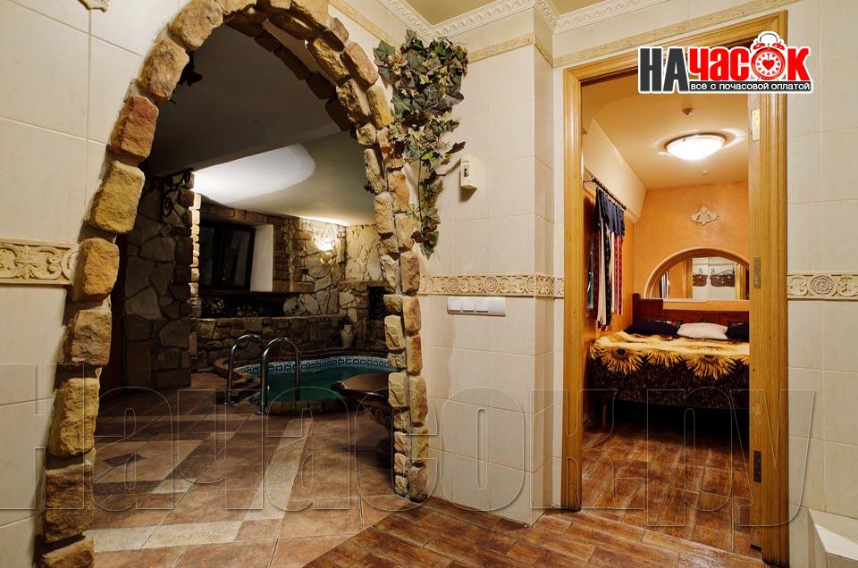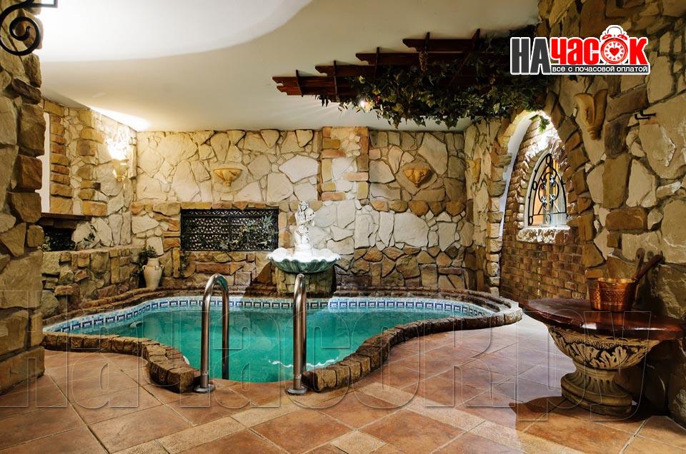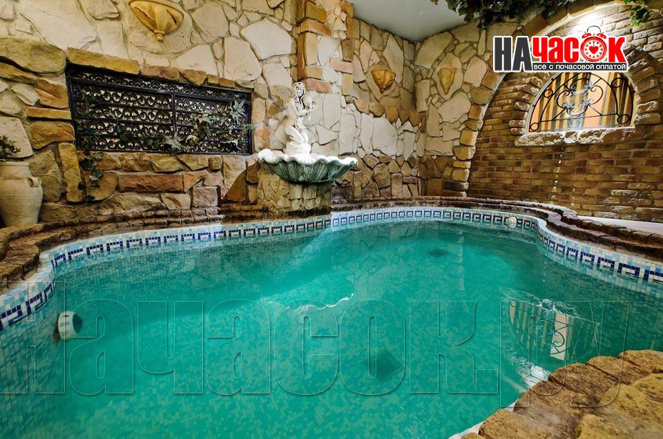 Помещение с бассейном облицовано диким камнем, пол выложен нескользкой плиткой. Бассейн имеет красивую замысловатую форму, его украшает фонтан в виде девушки, сидящей в открытой раковине с кувшином в руках. Здесь очень красиво и уютно.