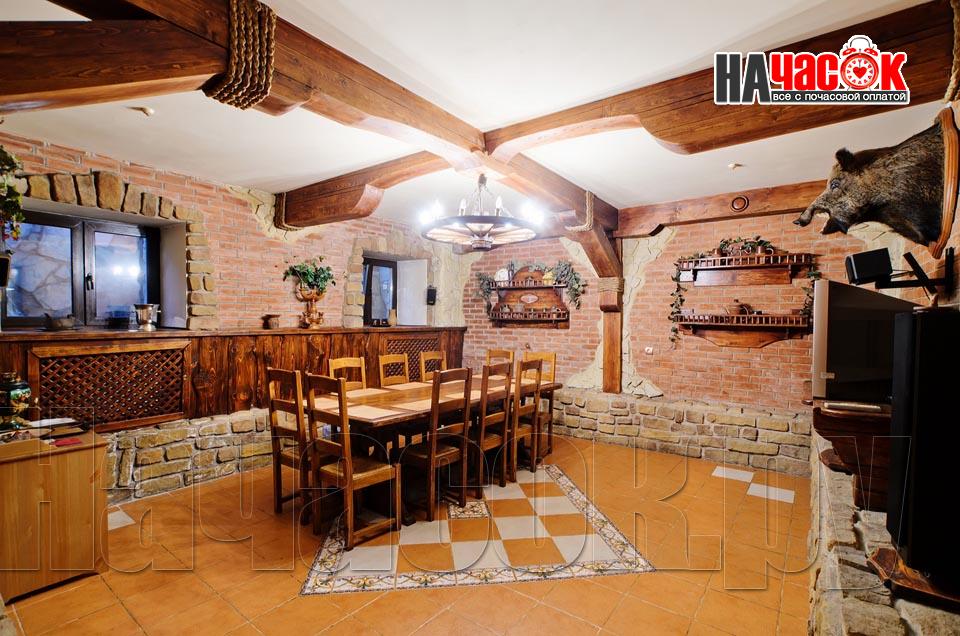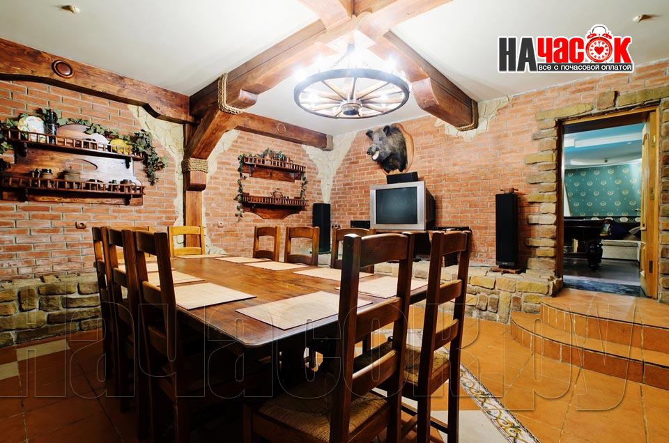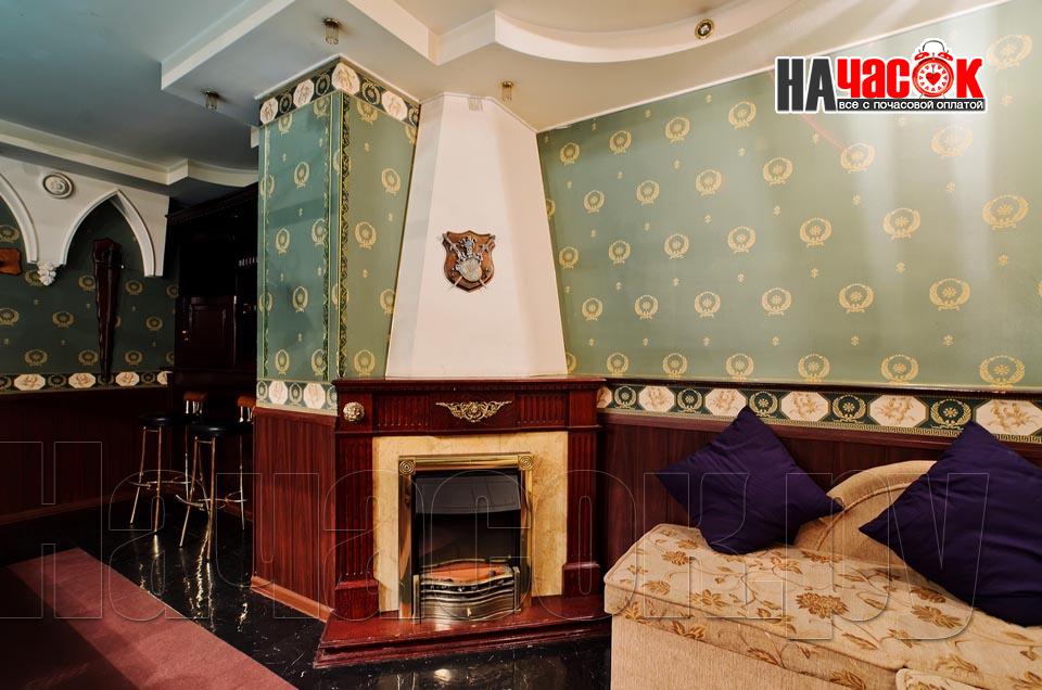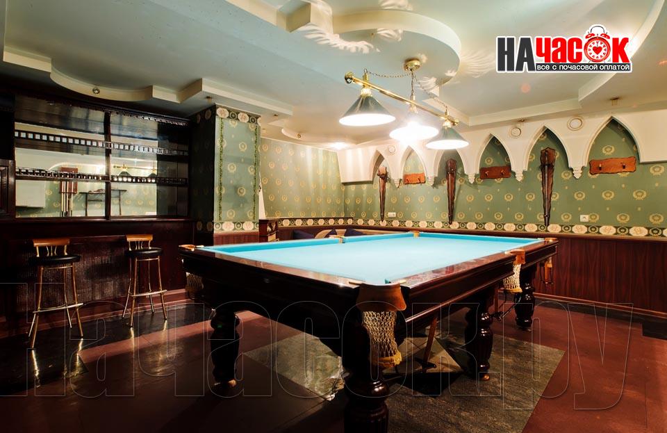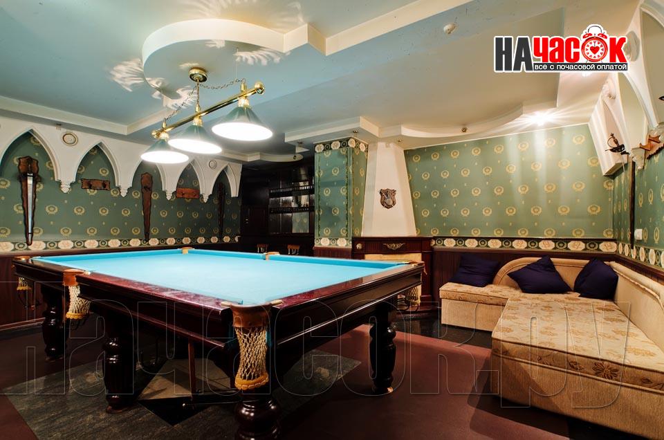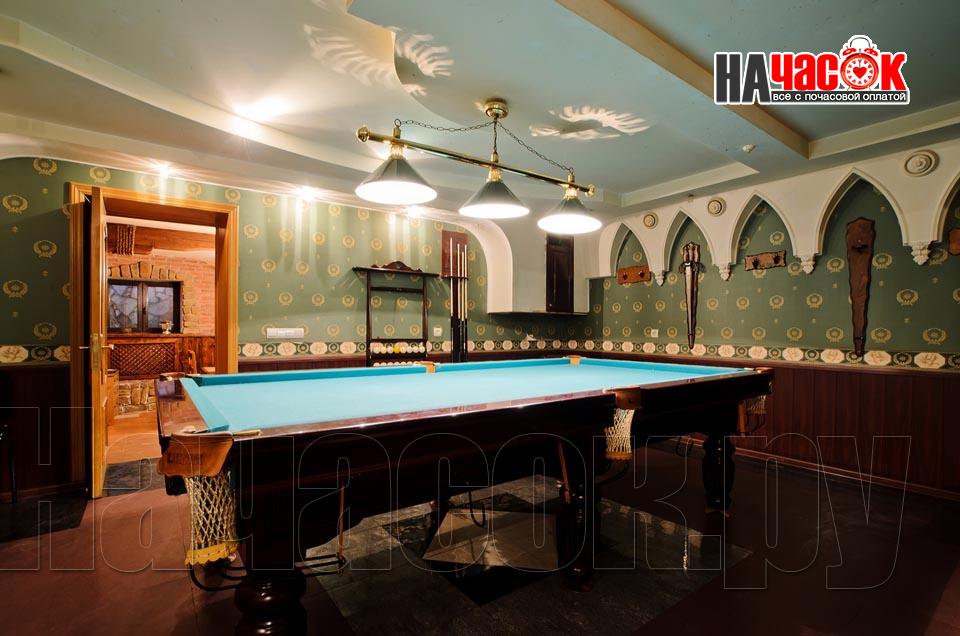 В отдельной комнате находится бильярдная. Здесь установлен стол для игры в русский бильярд, освещаемый тремя потолочными светильниками. Для дополнительного удобства в бильярдной предусмотрели красивый камин и мягкий диван.