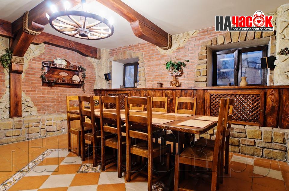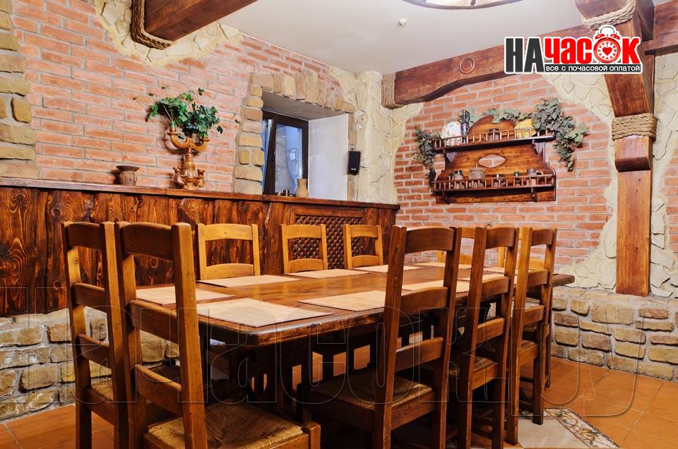 Зал отдыха сауны «СПА-Релакс» исполнен в стиле греческой таверны. Кирпичные стены украшены кладкой из дикого камня. Массивные деревянные балки, большой стол и стулья дополняют интерьер. В качестве декора использованы охотничьи трофеи, деревянные подвесные полки и подсвечники. Освежают помещение вьющиеся зеленые растения, украшающие деревянные балки и полки.