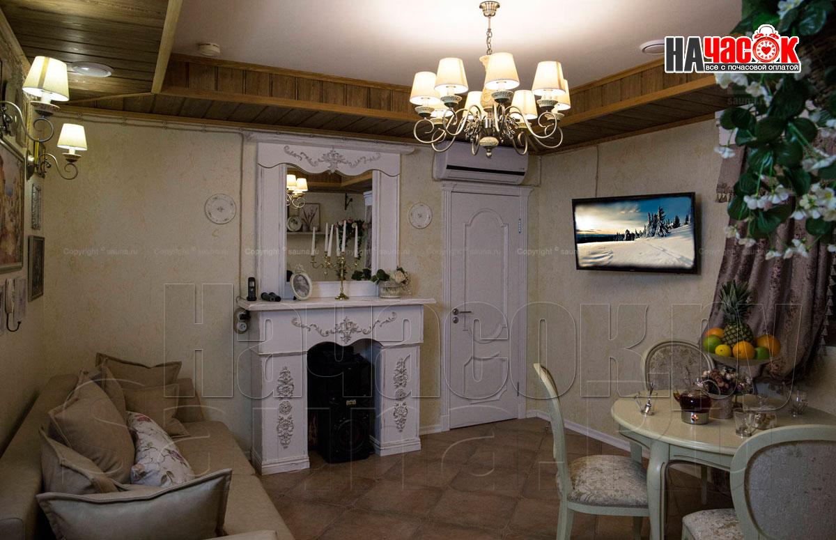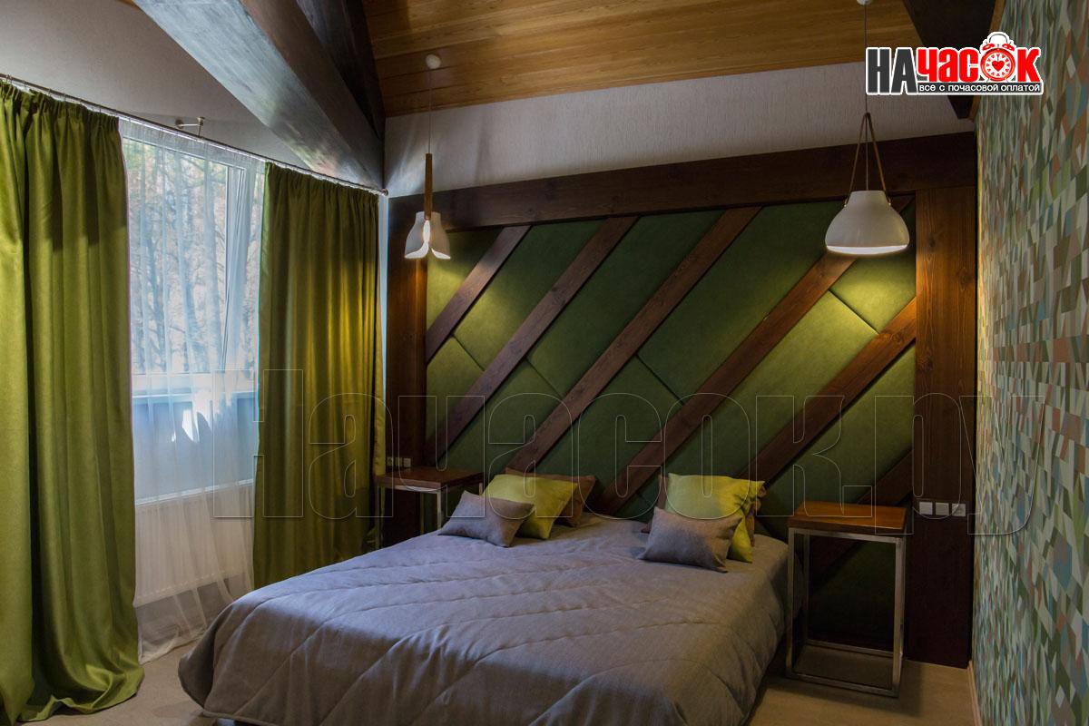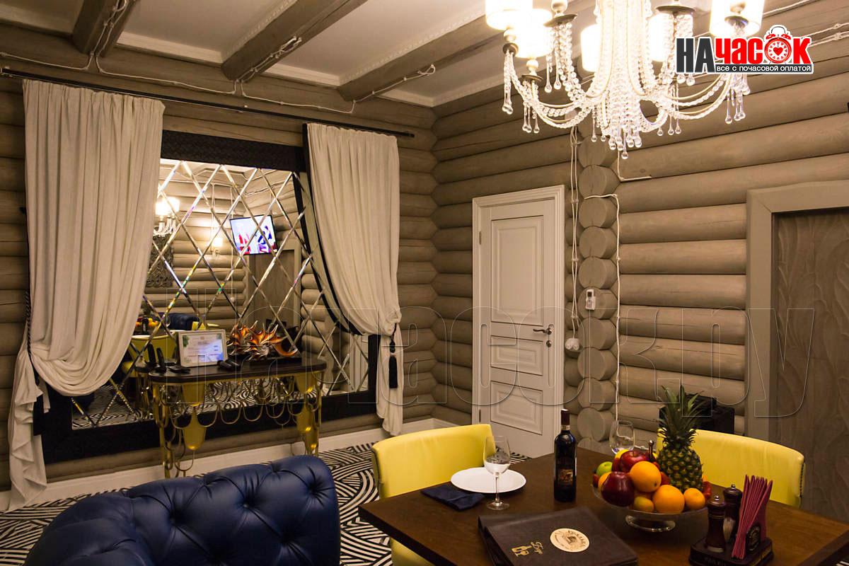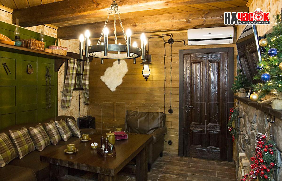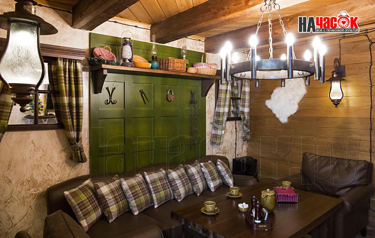 Этот номер так же выполнен в ретро стилистике, но на контрасте с номером "Прованс" выполнен в тёмной коричнего - зелённой гамме. Здесь использованы экологичные материалы, много дерева - обивка стен, кованные светильники, шкуры в сочетании с тёмной кожаной мебелью. Уютный зал с камином. Русская парилка, ТВ, муз центр, профессиональное караоке. |