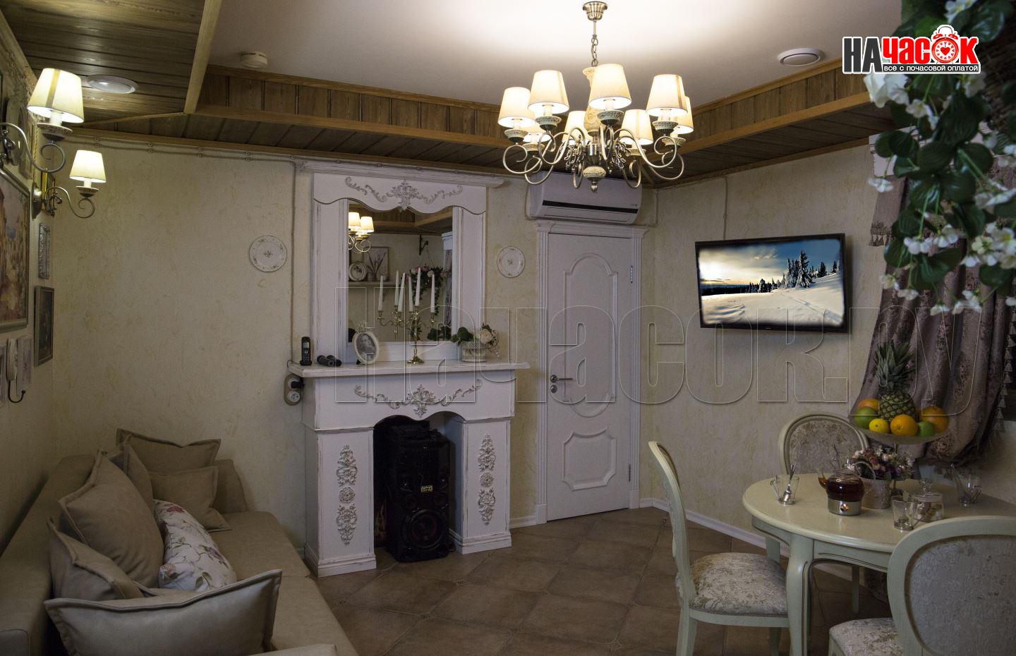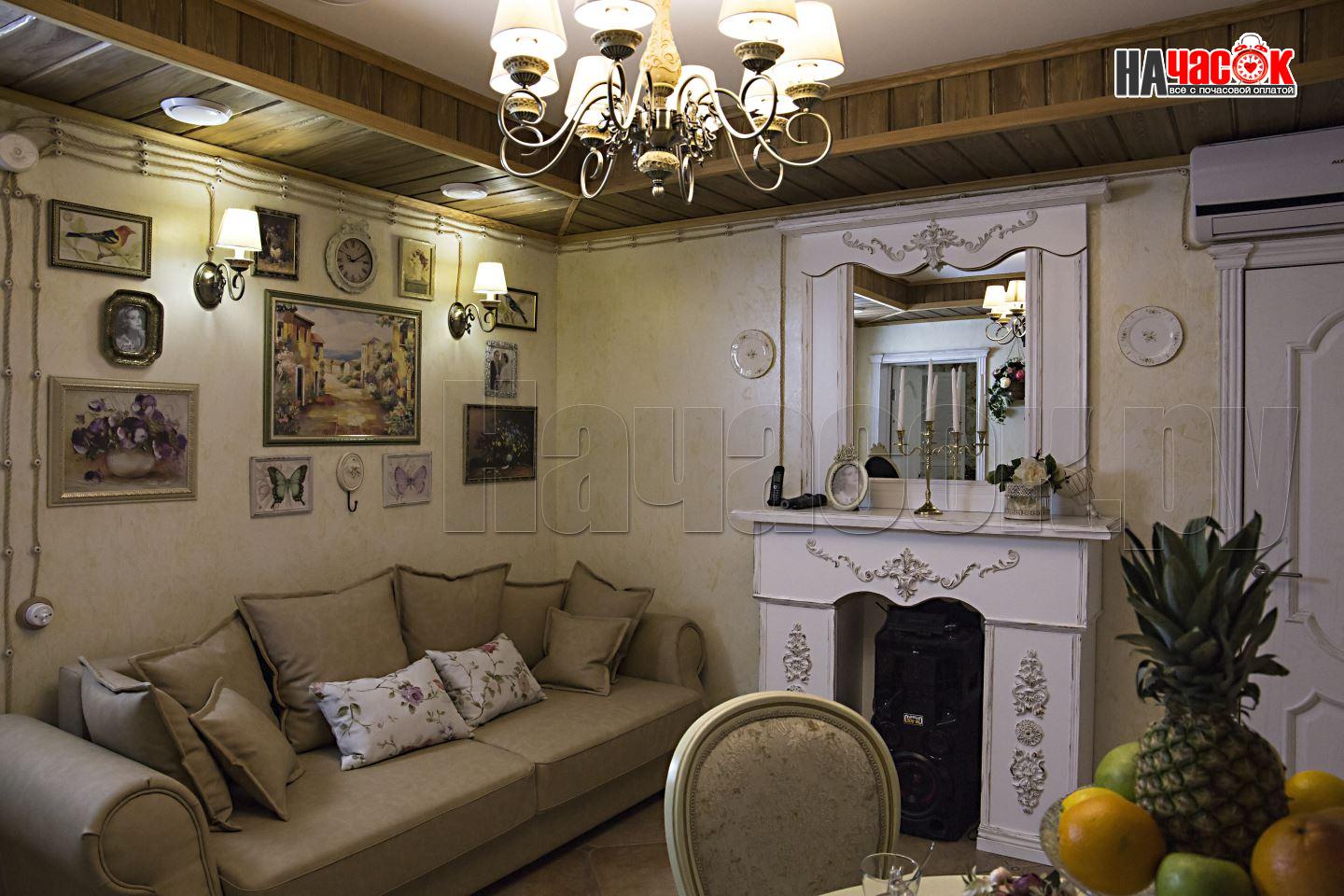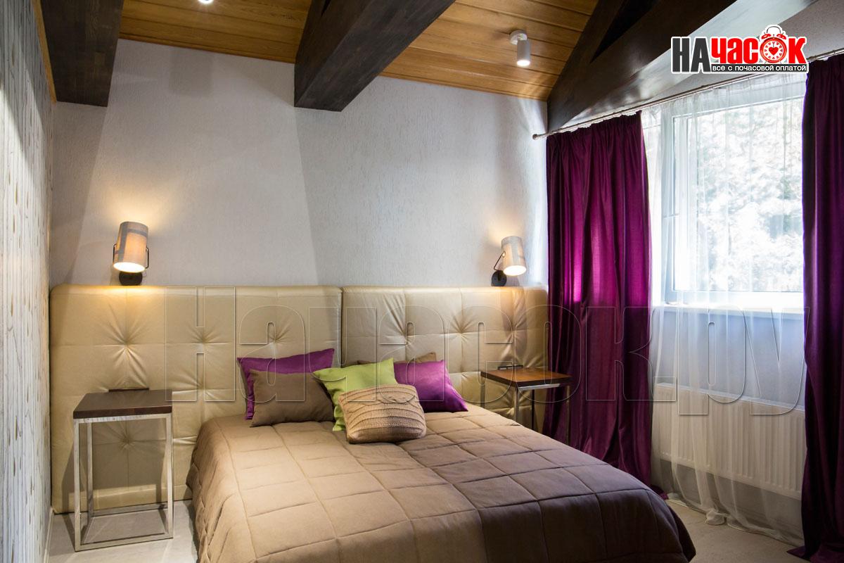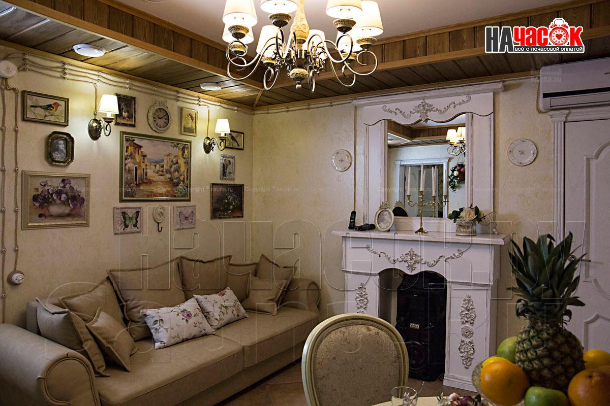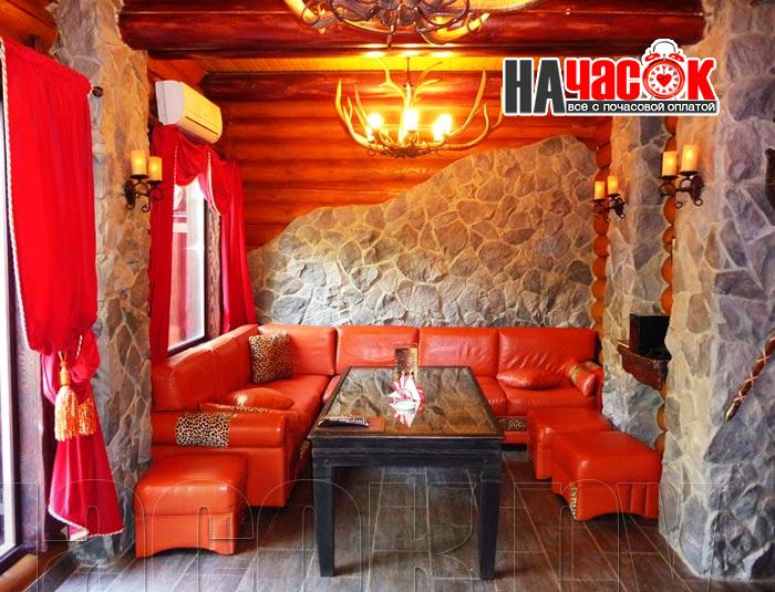 Этот номер так же выполнен в ретро стилистике, но на контрасте с номером "Прованс" выполнен в тёмной коричнего - зелённой гамме. Здесь использованы экологичные материалы, много дерева - обивка стен, кованные светильники, шкуры в сочетании с тёмной кожаной мебелью. Уютный зал с камином. Русская парилка, ТВ, муз центр, профессиональное караоке. |