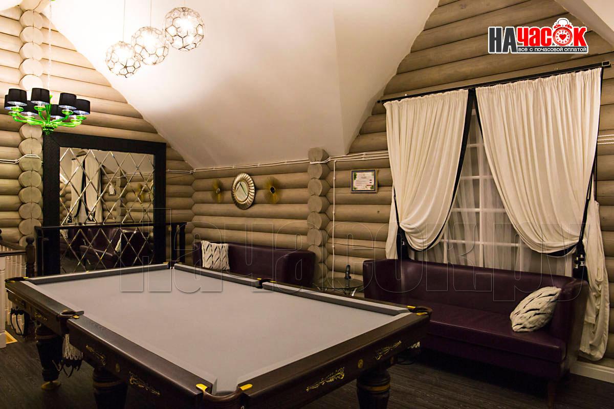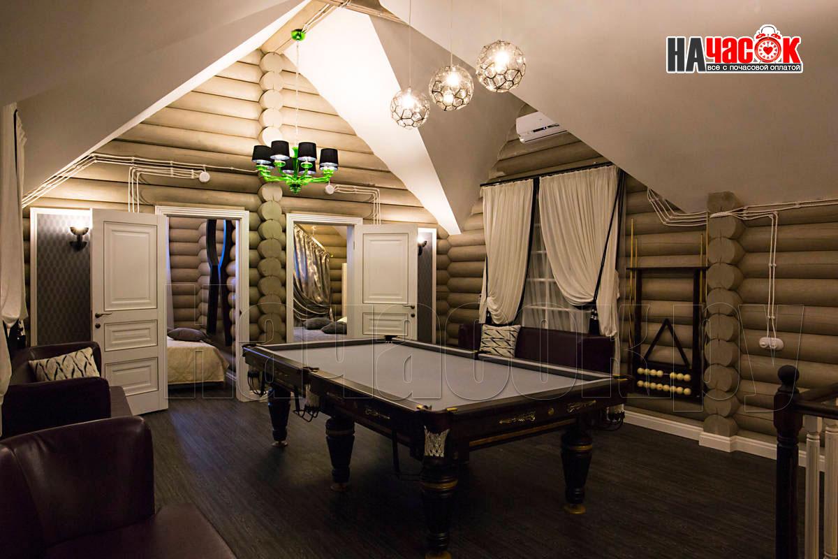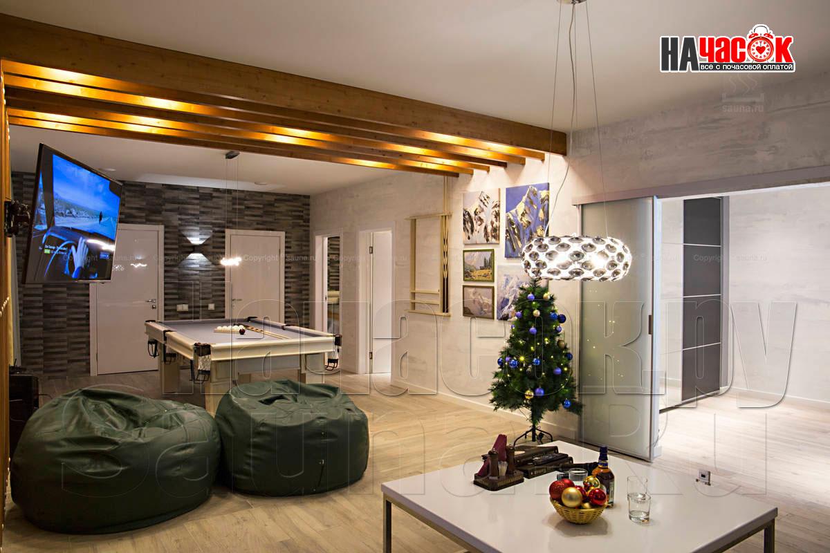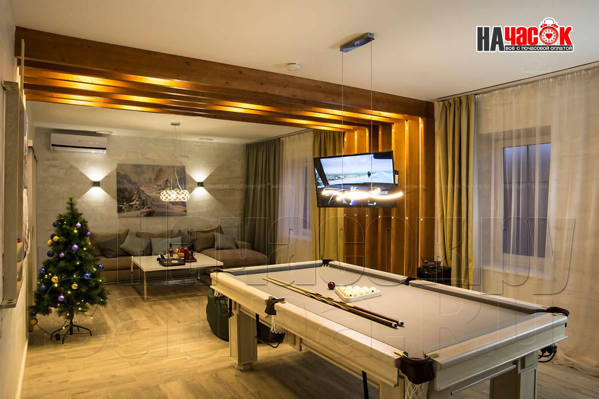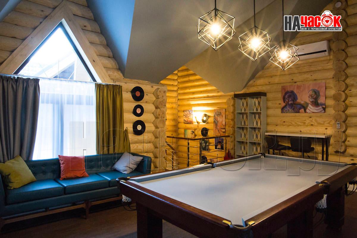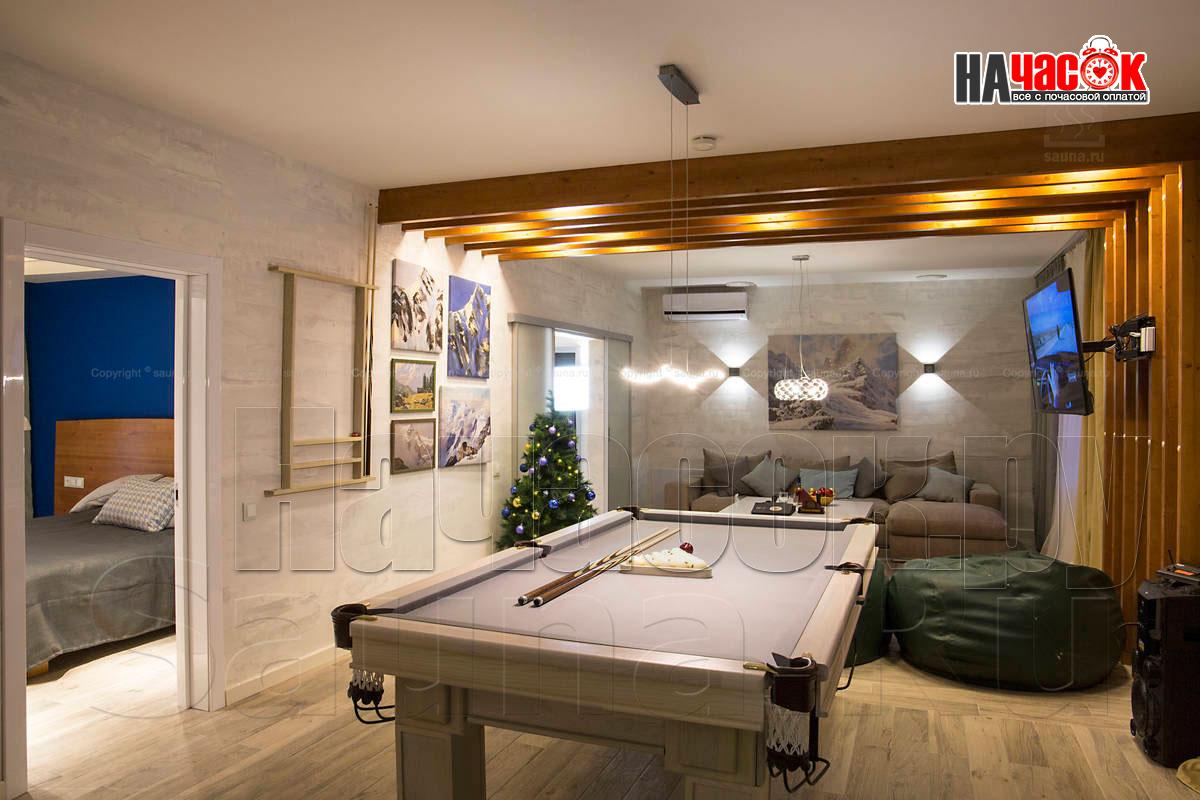 Оформленный в современном стиле, в светло-голубой гамме. Просторная релакс зона с диваном и пуфами, зона с бильярдным столом, ТВ, профессиональное караоке, 2 комнаты отдыха, парная. |